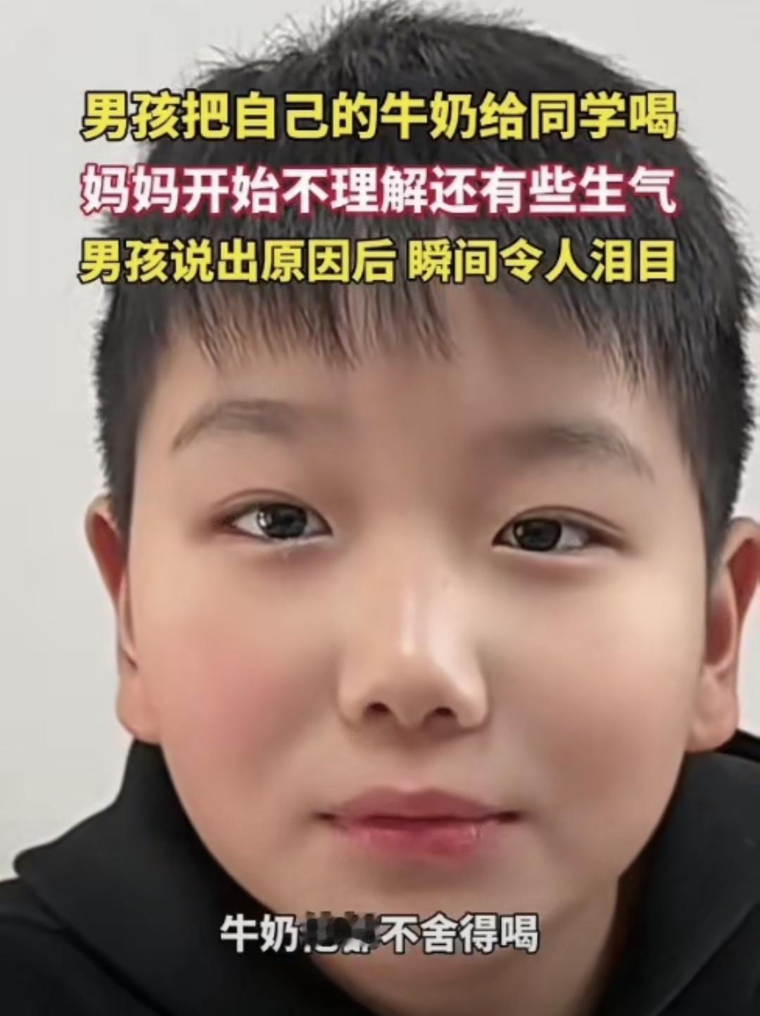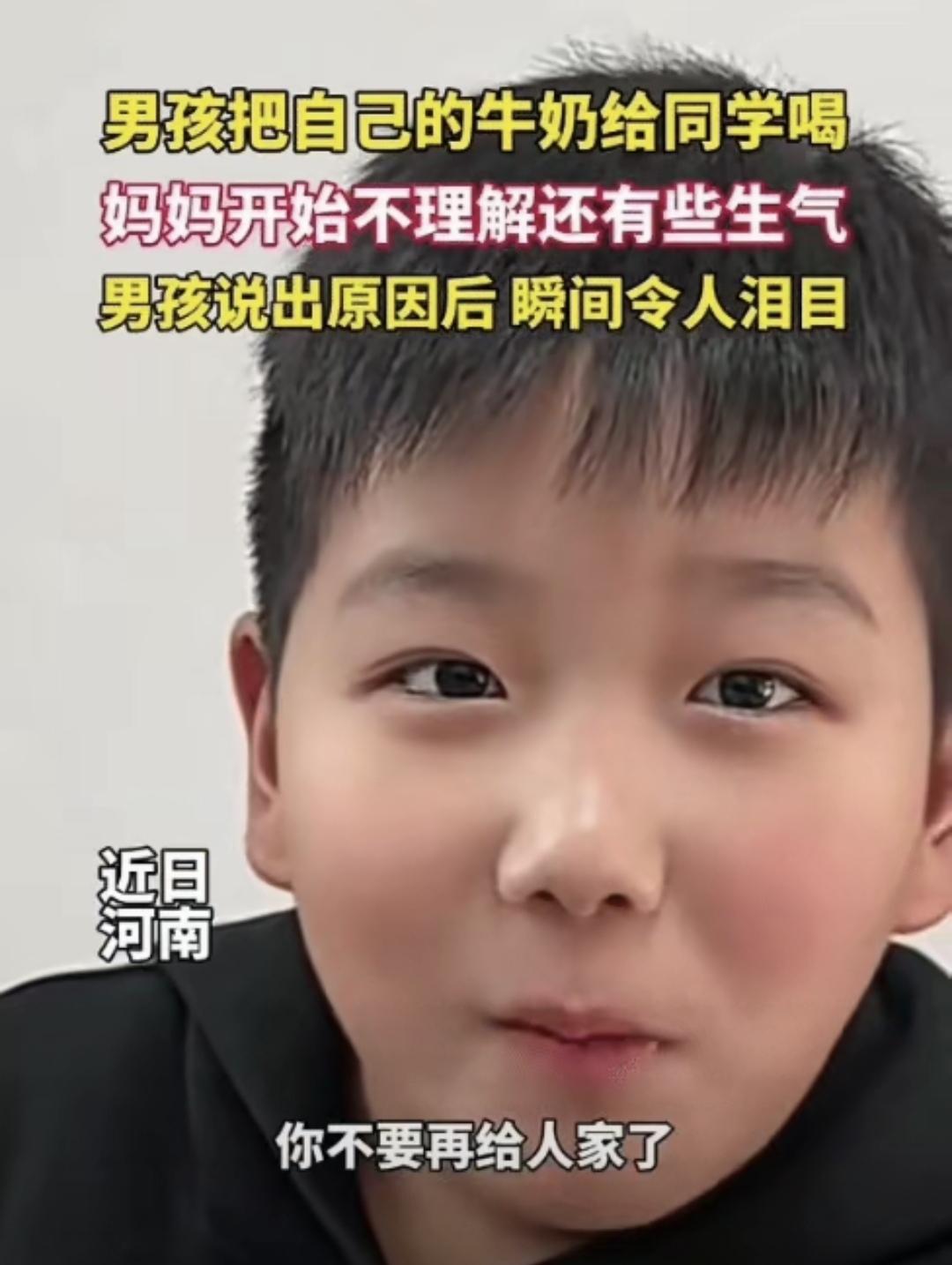 这位给同学送牛奶的小伙又给我们上了深刻的一课,人品是这个世界上最重要的,与成绩,与家境无关! 河南,一位妈妈说儿子,我今天看到你又把牛奶给同学了,这是怎么回事? 刚开始这位妈妈还有生气,带着责备,儿子带去的牛奶基本上没有自己喝过,全偷偷给了同学,想着自己花钱买的,结果儿子却那么大方,说送人就送人,是不是没有想过爸妈挣钱的不易! 妈妈说“他妈妈不给他买吗”? 可儿子接下来的话让妈妈立马觉得羞愧 儿子说“他没妈妈” 妈妈瞬间觉得自己那话不该说出口 她吩咐儿子“你以后每天就带两瓶,自己一瓶同学一瓶” 可儿子试探性的问“妈妈,我可以带三个吗?他还有个小妹,他自己都不舍得喝,全让给妹妹了”! 妈妈听后说“管管管”,两人相视一笑 男孩懂了妈妈,妈妈也懂了孩子,自己娃那么善良懂得心疼人,这是多么值得骄傲的事情啊! 这个视频一出来,网友们纷纷赞扬孩子的善良,知道心疼人,也有会看面相的宝子说“这孩子以后肯定是有福气的人”,还有人说“学习无关课本知识的分数,他的这个举止,无疑,他已经是最高分了”! 但也有一些不好听的声音存在 有人说“自己都吃馒头咸菜白粥了,还操心别人有没有牛奶喝”? “我有个哥哥就是这样一个为别人着想的人,最后他混的最差,以前他帮助过的人都忘记他了”。 有句好话说的好“福未至,祸则远矣”,助人本是好事一件,男孩给同学送牛奶温暖他的心,他和妹妹一定也不会忘记在自己的成长过程中曾经有这么一位暖心的人,被帮助的同学妈妈在天堂也会保佑他的,因为我相信善良是有感染力的,你们说是吗?