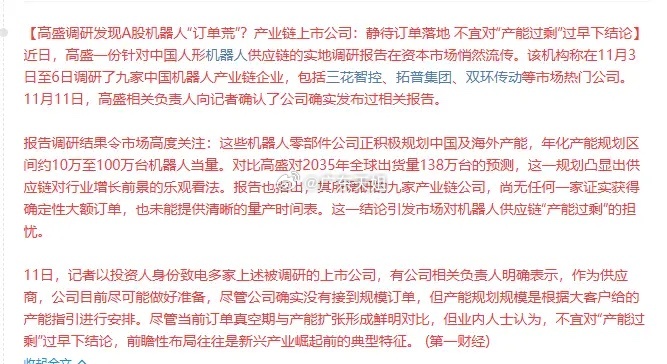 刚刚,机器人行业传来一个利好,一个利空。利好是特斯拉扩建超级工厂,拟年产1000万台人形机器人。利空是机器人产业链产能过剩消息。11月以来机器人板块表现较差,仅小鹏机器人消息刺激了方正电机走出来,而整个机器人板块调整为主。机器人中长期是确定性的产业逻辑,但缺乏催化,晚上两个消息都算重磅,明天肯定有催化。1.特斯拉准备扩建得州超级工厂 ,拟年产1000万台Optimus人形机器人。2.高盛调研发现A股机器人“订单荒”?产业链上市公司:静待订单落地 不宜对“产能过剩”过早下结论。