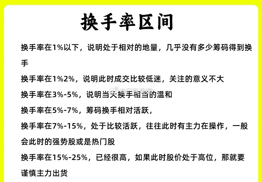 注意啦!大多数技术指标都存在一定滞后性,不过成交量和换手率却是例外,它们能即刻反映市场力量状况。毕竟这两个指标都是真金白银堆积出来的,而且二者相辅相成。成交量大家都比较熟悉,今天天姐就来跟大家分享一下换手率。市场上有句俗语叫:“炒股不看换手率,再炒十年也枉然”,由此可见,在一些炒股高手眼中,换手率是多么重要。还是老规矩,点赞收藏,或者在评论区留言“六六六”支持一下。天姐每天都会分享炒股干货,这样以后大家想复习的时候就不怕找不到啦。换手率的数值代表着什么呢?简单来讲,我们可以把个股的市值看作100%,要是今天有5%的筹码发生了换手,那今天的换手率就是5%,现在大家明白啦吧。我们可以依据换手率的大小来判断个股的强弱,大致可以分为六种情况:• 换手率在1%以下,表明处于相对地量状态,几乎没什么筹码换手。• 换手率在1% - 2%,说明此时成交较为低迷,关注价值不大。• 换手率在3% - 5%,意味着当天换手相当温和。• 换手率在5% - 7%,筹码换手相对活跃。• 换手率在7% - 15%,处于比较活跃的状态,通常这个时候会有主力操作,一般是强势股或者热门股。• 换手率在15% - 25%,已经很高了。如果此时股价处于高位,那就要警惕主力出货。接下来再讲讲几种常见的换手率表现:一、低位低换手为弱势当股价处于低位,且换手率还很低时,说明这只个股属于冷门股,没多少人关注,市场活跃度极低。后市往往会继续横盘整理或者回调,关注意义不大。二、低位高换手为启动若股价在低位,换手率突然大幅升高,这表明有主力在吸筹。换手率越高,筹码换手就越充分。三、高位低换手为锁仓股价在一轮上涨的中继阶段,处于上升趋势时,换手率很低,这说明主力已经开始锁仓,市场上流通的筹码大多是散户在卖出,主力已经实现控盘。四、高位高换手为出货股价经过长时间上涨,处于高位,此时换手率也很高,比如大于20%(当然大盘蓝筹股和中小盘股的数值会有所不同,大盘蓝筹股可能15%就算很高了),那就说明主力在出货,于高位派发筹码。好啦!以上就是今天的全部内容,六种换手率区间的划分以及四种常见的换手率表现,大家记住了吗?希望这期内容能对大家有所帮助或启发,记得帮天姐点赞转发哦,咱们下期内容再见!