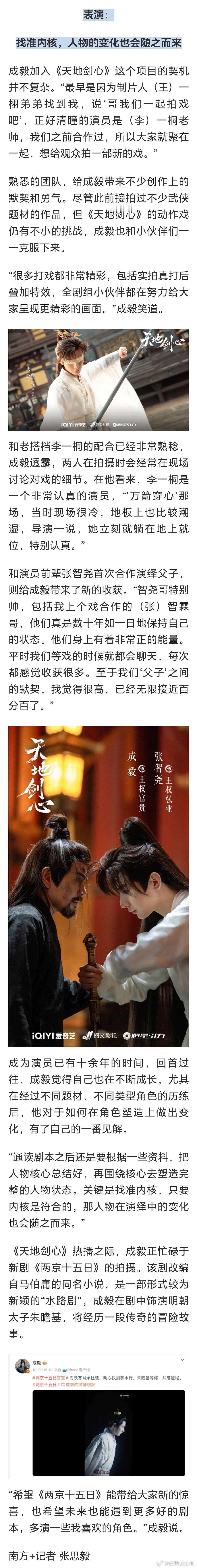 成毅《天地剑心》南方日报专访全文,通过文字真的能感受他的赤诚,他对角色解读和观众看到感受到完全契合。他是能读懂角色,也有能力准确的表现出来。没有卖惨没有抱怨,真体面人了