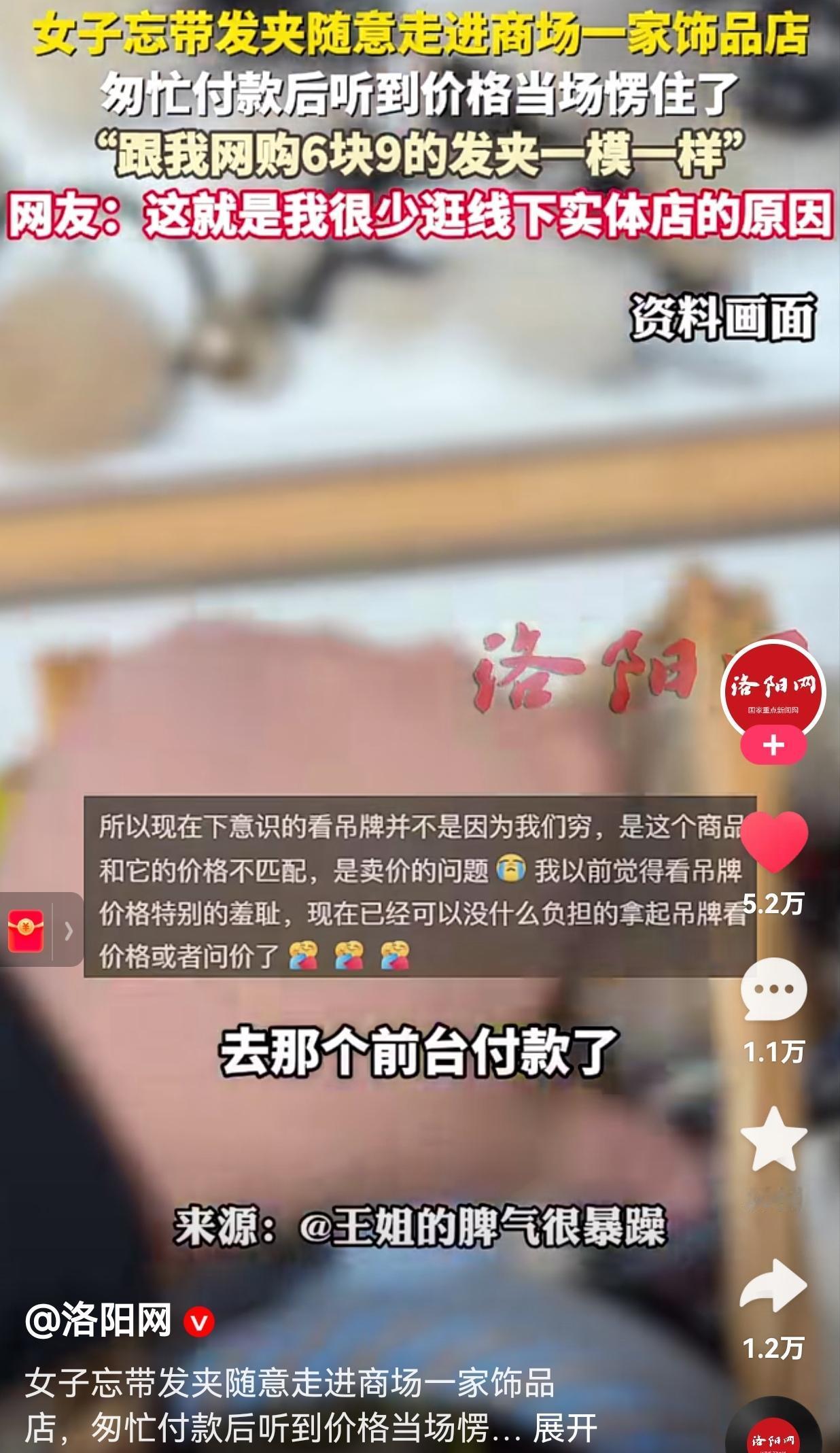 吃一堑,长一智!下次就不会犯同样的错误了!一女子和老公提前约定,等老公下班,一起去吃火锅。 那天,为了吃火锅,女子还特意洗了个头发。由于走的比较急,就忘记带发卡了,半路上才想起自己没有带发卡,如果回家取的话,岂不是浪费时间了吗? 因此,女子打算在饰品店买一个发卡,你还别说,女子还挺幸运的,就在火锅店的旁边找到了一家小饰品店。 由于时间紧,任务重,为了不耽误吃火锅,女子没有看价格,随手拿了一个发卡。 结果,付账的时候,女子傻眼了怎么扣了56元呢?难道这是什么牌子的发卡吗? 等女子吃完火锅,回到家,跟以前在拼多多的发卡进行对比,结果,两个发卡除了颜色不一样之外,外观、样式都是一样的。 女子不禁发出感叹:“这就是买东西不看价格的原因。如果当时仔细看一看价格,就不会让自己后悔了!” 网友看到后评论说,实体店的东西确实贵的离谱,所以,生意不好也是有原因的。 其实,很多人都有过这种类似的经历,如果自己很着急,又比较需要这种东西,而且,自己认为这种东西又不值什么钱?我们一般都不会看价格的,也不会询问价格,拿起来就会付账。最后,却吃了价格上的亏。 我相信,有过一次经历,下次肯定会长记性的,不会再这么冲动了。买之前肯定询问价格,价格合适了再买,价格不合适就不会买了。 大家觉得呢?欢迎大家评论区讨论留言。