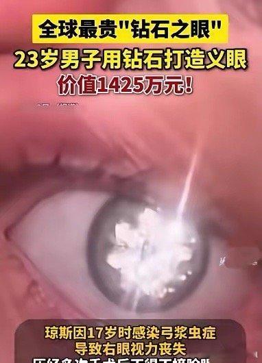 看看这个美国男子的义眼多闪多美,闪闪发光。知道吗,这个年龄只有二十三岁的帅小伙是名珠宝商。他在十七岁时不幸染弓浆虫导致眼睛失明了。后来他用价值一千四百二十五万元的钻石,给自己失明的眼睛打造了闪闪发光的义眼。义眼非常的奢华又时尚,特别的闪亮。做这样的义眼很有想象力和创意,弥补了遗憾又美观。大家觉得呢!