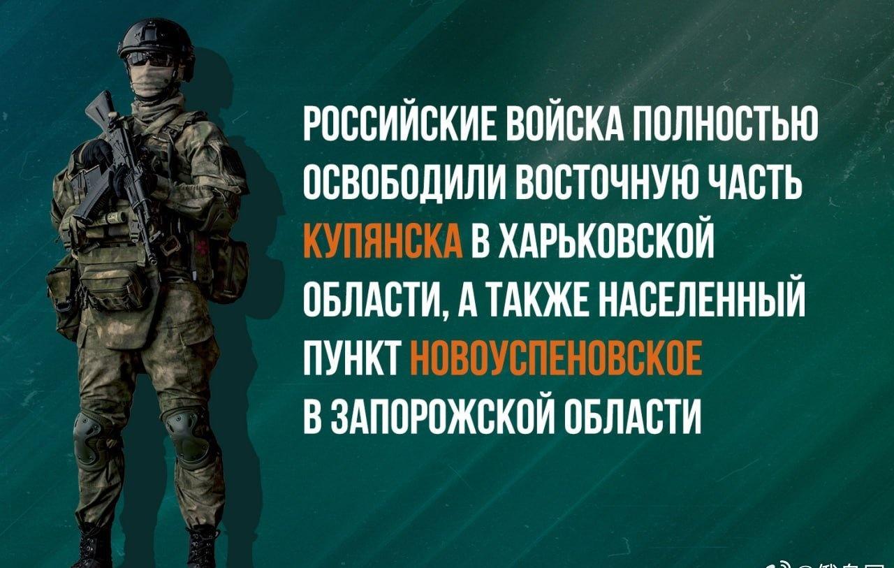 俄罗斯联邦军队完全解放了哈尔科夫州库皮扬斯克的东部,以及扎波罗热州的新斯波诺夫斯科耶定居点。