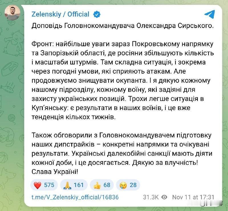 【泽连斯基:大雾天气更利于俄军在波克罗夫斯克与扎波罗热发起攻势】 11月11日,泽连斯基在电报频道发文称,乌军总司令亚历山大·西尔斯基向其汇报了相关工作。全文如下: 前线方面:当前重点关注波克罗夫方向及扎波罗热州,俄军在这两个区域正加大进攻力度与规模。当地战况严峻,且受天气条件影响(持续浓雾),更利于敌军发起攻势,但我们仍在持续歼灭占领者。感谢所有参与保卫乌克兰阵地的部队与士兵。库皮扬斯克方向的局势稍缓:乌军已取得战果,且这一态势已持续数周。 此外,我与总参谋部就远程打击准备工作进行了讨论——明确了具体打击方向及预期成果。乌克兰远程武器每日持续发挥作用,这一目标已实现。感谢精准打击。