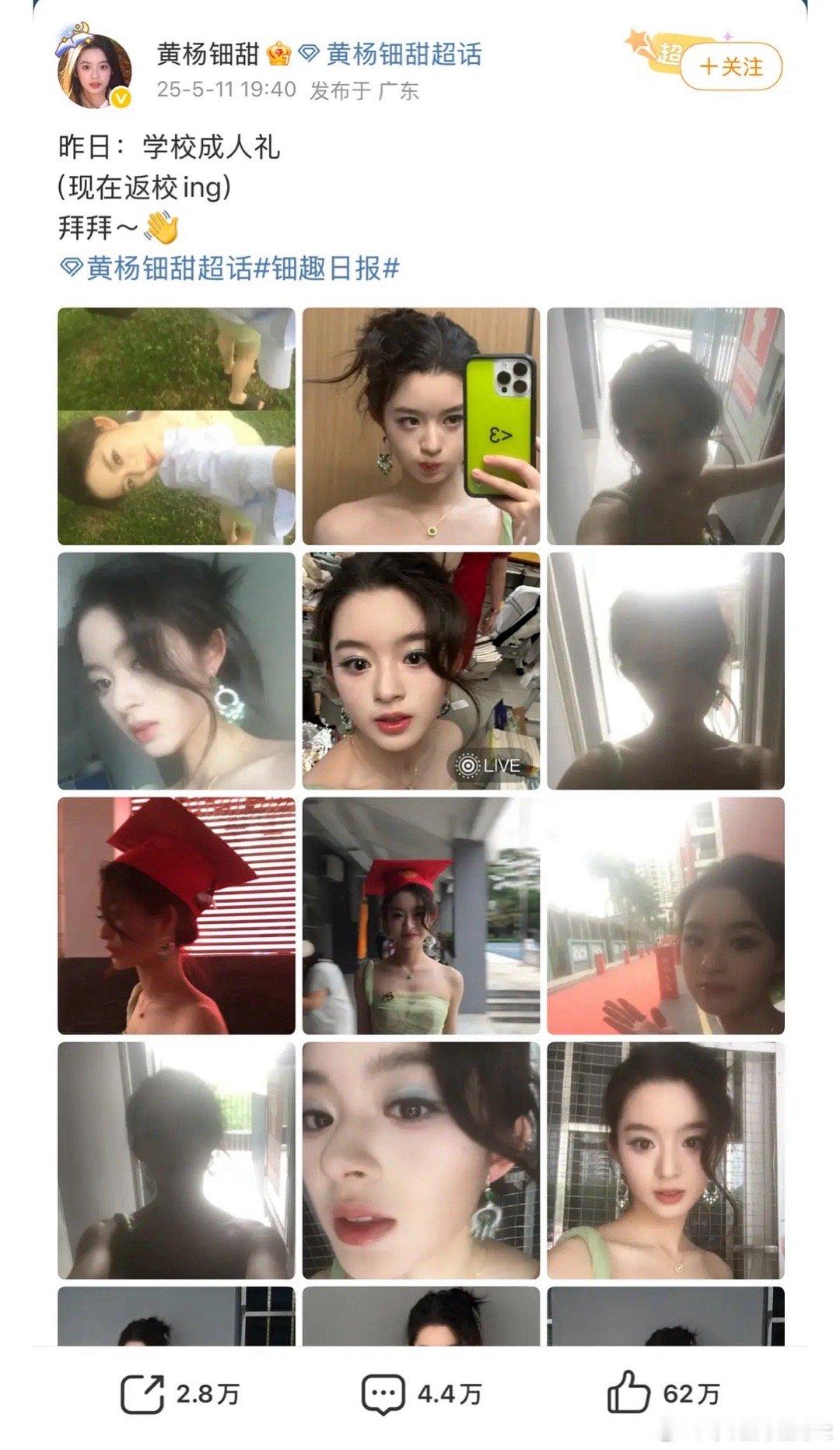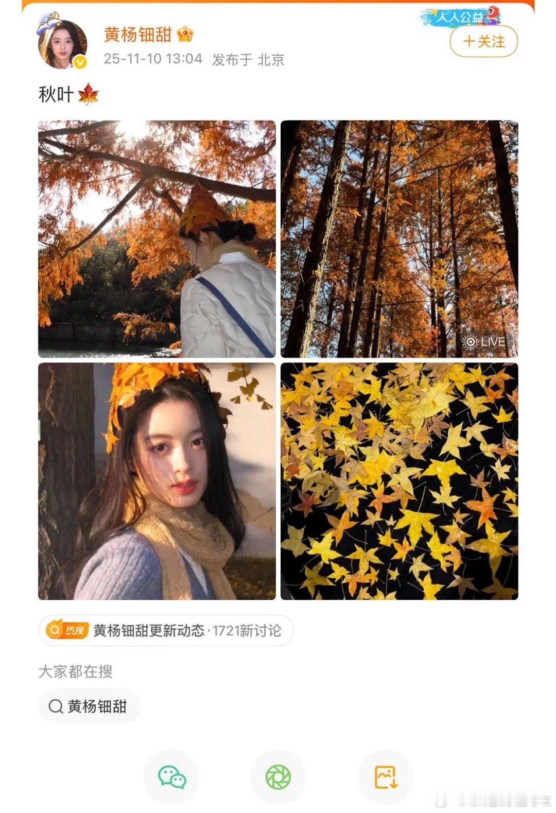 黄杨钿甜发微博了,拍了秋叶。之前成人礼那条微博还在,天价耳环的风波这算是过去了吗