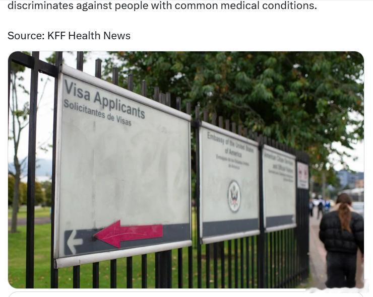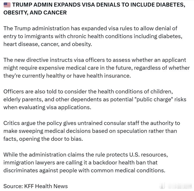 特朗普政府扩大签证拒签范围:包括糖尿病、肥胖症和癌症特朗普政府已扩大签证政策,允许拒绝患有慢性疾病的移民入境,这些疾病包括糖尿病、心脏病、癌症和肥胖症。新指令要求签证官评估申请人未来是否可能需要昂贵的医疗护理,无论他们目前是否健康或是否有医疗保险。签证官还被指示在评估签证申请时,将申请人子女、年迈父母及其他受抚养人的健康状况视为潜在的“公共负担”风险。批评者认为,该政策赋予未受专业训练的领事官员权力,让他们根据推测而非事实做出广泛的医疗判断,这可能导致偏见。