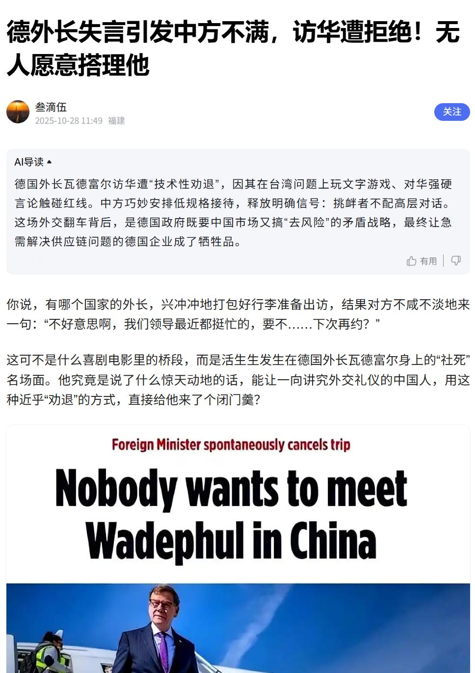 德国人太痛苦了,太拧巴了。从欧洲媒体的字斟句酌中,你都能看出来他们那种痛苦拧巴的心态。之前,德国外长瓦德富尔原想到中国访问,但因为在台湾问题上胡说八道而被中国拒绝,中国的理由是北京除了王毅外长之外,没有任何官员有时间搭理他。瓦德富尔事件让德国是既丢了面子,又丢了里子,现在德国政府准备再派财政部长克林贝尔再次访华,找回里子面子,但是欧洲媒体又扭扭捏捏的用了“中国寄希望于德国财长克林贝尔的来访”——弄得好像中国现在死活都离不开德国一样。到底是谁离不开谁?我倒不是支持中国跟德国人偏要争这个主动被动,但是,很多事情往往就因为在这种别别扭扭扭扭捏捏的心态纠缠中丧失掉最好时机的。欧洲已经老了,老掉渣了,老无用了,欧洲不会对中国崛起再形成任何威胁了。相比于欧洲的痛苦拧巴,我觉得还是美国特朗普政府的简单直接更可爱,也好打交道。