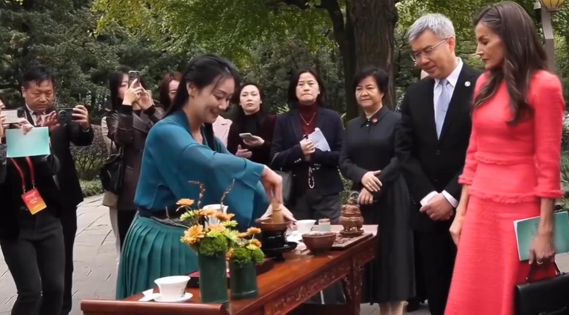 西班牙王后体验中国茶文化,并亲手为“熊猫点睛”,参与茶艺拉花的样子美翻了!11月11日王后陛下观看成都盖碗茶表演,茶艺师斟茶就像表演功夫。 除了制作茶,斟茶,还有茶艺师制作茶艺拉花,在茶杯里画一个熊猫图案,还邀请王后陛下为熊猫画眼睛,没想到首次用中国茶制作拉花的王后陛下认真极了。 只见她一手拿着一本书一手拿着制作拉花的工具,这个工具像个木筷子,不过比筷子要细要短,亲手为熊猫拉花图案点睛,画面唯美宛如一幅画!