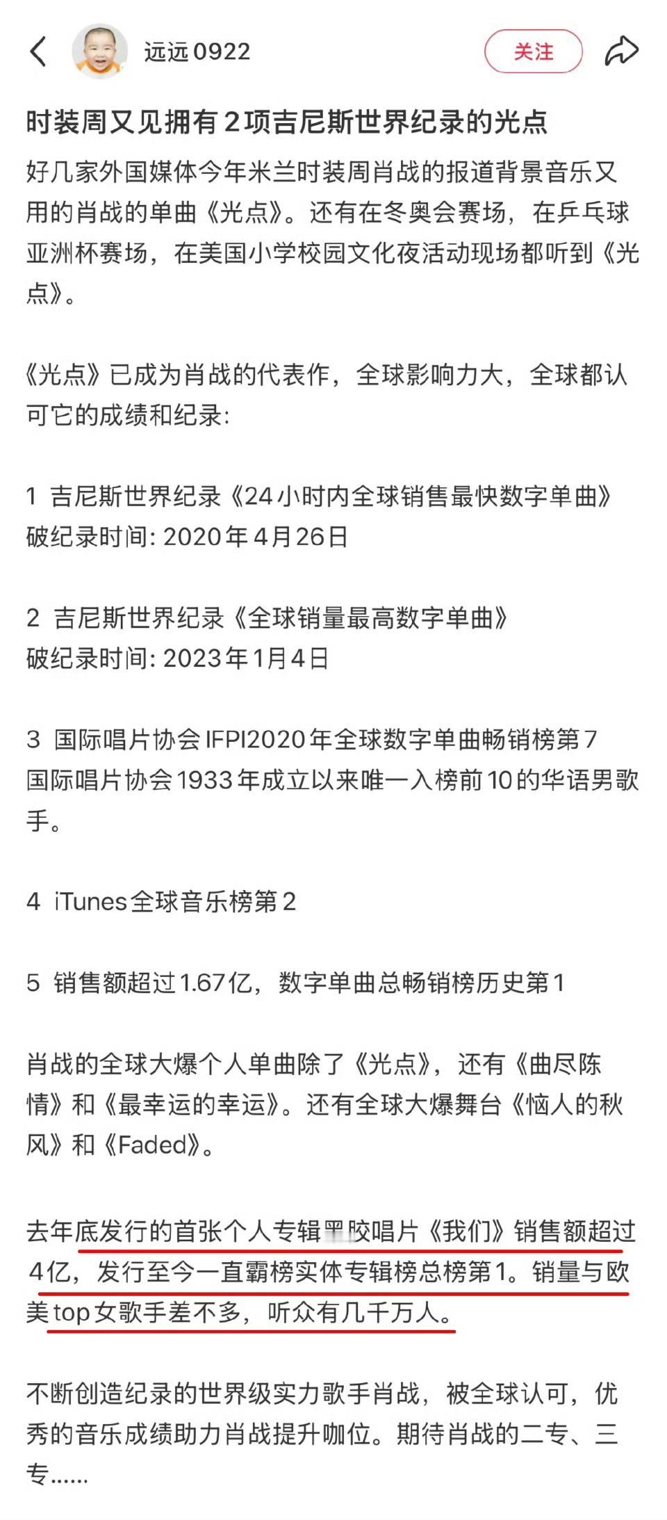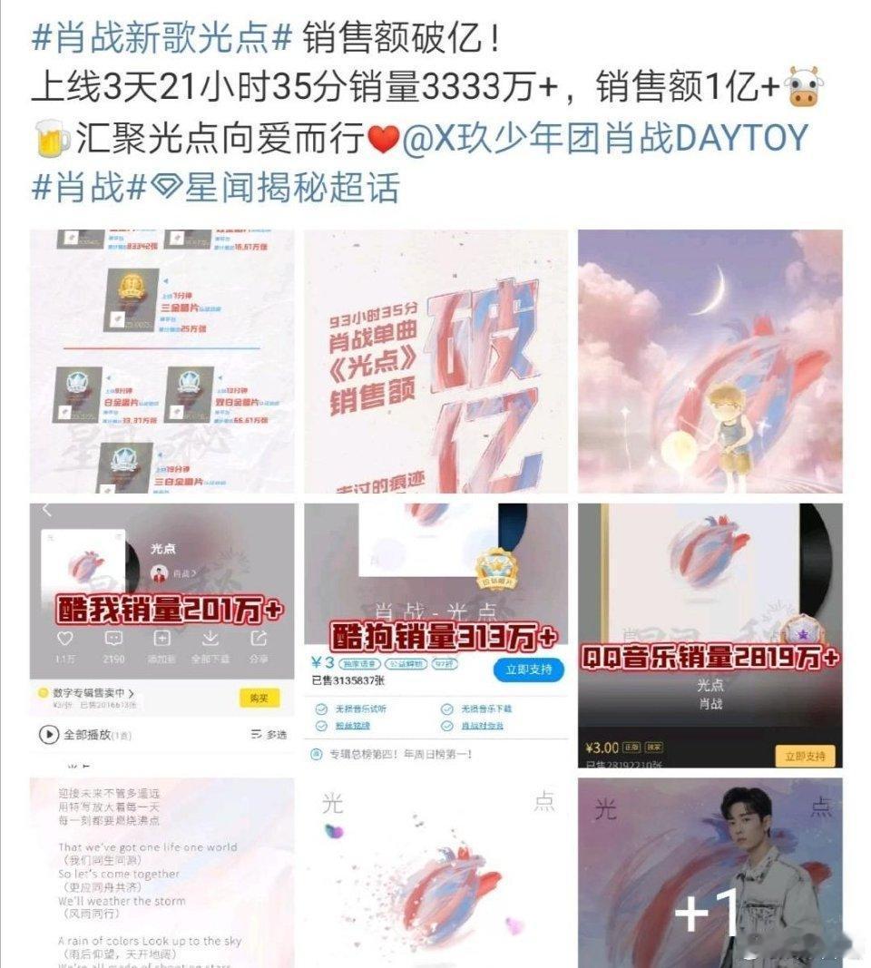 一转眼《光点》都五周年了,有新粉入坑肖战,了解到《光点》这首歌曲时,一直在惊叹自己低估了肖战的影响力,只知道3块钱卖了1.6亿,完全没想到是全球销量最高! 2年前: 单曲光点无宣传凌晨空降,93小时破亿,並取得1.628亿销售额,创单曲销量之最! 2年后: 无宣传空降iTunes,並迅速取得iTunes全球榜第2, 欧洲区第4,美国区第7,日本第13! 光点发布当天,销量一路飙升,工作室担心,发帖提醒大家理智购买,然后粉丝们说,都是成年人,自己的钱包其他人管不着。也记得有人说,学生党不要花钱,想听的话,他可以送。 还有很多造谣说粉丝都是十几岁啥的,还有造谣是小学生偷家长钱买的,气得好多小飞侠把房产证、汽车钥匙、基金、余额宝的余额都拿来自证自己财务自由,买首歌还要自证自己是成年人,当时好多晒各种证证明自己的钱包自己做主的! 刚去看了一下才发现,都忘了自己买了那么多,那会儿还被提醒理智购买,然后大家纷纷表示工作党财务自由,我的钱爱怎么花怎么花你少管!反正我记得那时候高兴一张伤心一张气愤一张,一点不心疼! 现在想想《光点》发行那几天其实挺有趣,很多人盯销量,半小时更新的时候销量页面都卡得刷不出来。最后过亿那一刻,突然感觉整个世界都安静了。在最黑暗的那段时间,光点是大家的一束光。肖战身上发生过太多神奇的事情,就是小说都不敢写的那种。 还记得当时因为太快过亿,粉丝都吵死了,有人觉得越高越好,有人觉得不能太快过亿,还有各种带节奏的浑水摸鱼的,而且大部队确实不懂,就吵吵闹闹地破亿了。 点点还有社区,是当年购买的人才能进入的,里面氛围可好了,我们叫“光乎”!也有很多打抱不平的路人,大家都在光乎摆摊可有意思了,当时点点子已经是虾圈货币了,我记得买啥要换算一下多少点点子! 这就是“你朝我丢泥巴,我用泥巴种荷花”的真实写照!点点小公主,是那一年好多少人的光啊,不仅开花还结果,而且惊喜连连,好运不断!凡此过往,皆为序章!走过的痕迹都成了光点! 很遗憾的是肖战还没有公开唱过新手歌曲,希望他开演唱会时能唱这首歌!