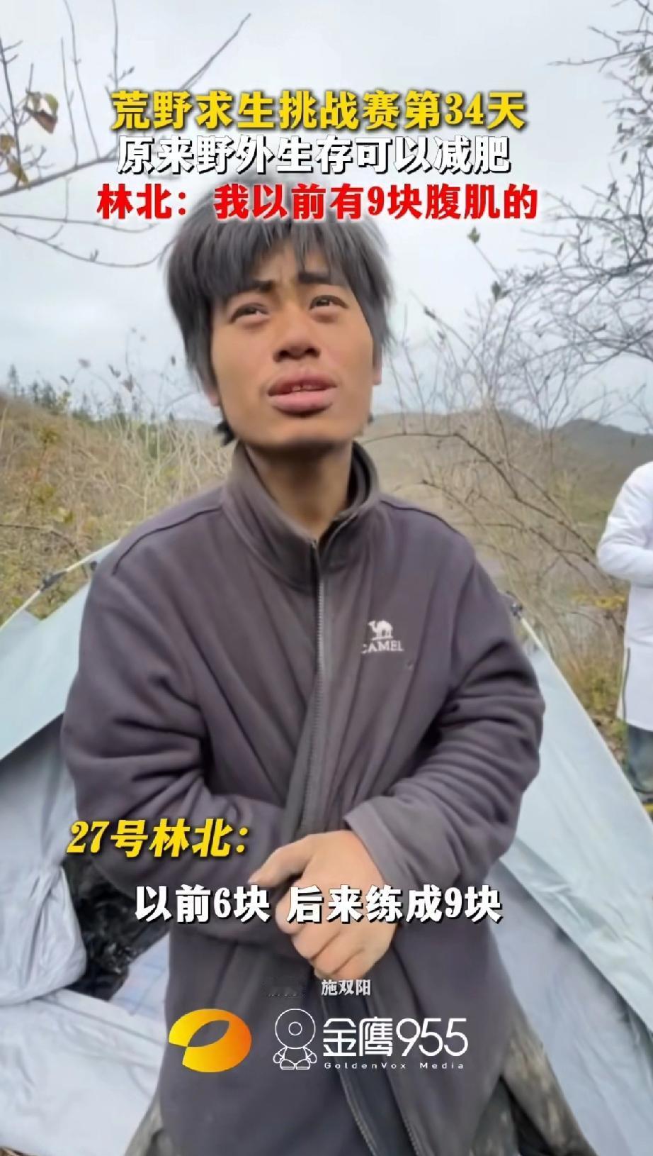 荒野“第一深情”林北今天展示了自己的之前的9块腹肌。 林北:原来有6块腹肌,后来练到9块!现在瘦的已经没有了,我怎么看着还剩下两块胸肌。 小伙子也很实诚这么冷的天让脱就脱了!看他侧着有脸明显的“下颚线”。这34天的荒野生活,不但把身上的9块腹肌给瘦没了,连原本“圆圆胖胖”的脸也瘦成瓜子脸了。 仔细看,唯独不变的就是那性感的嘴唇了[捂脸][捂脸][捂脸] 乐观的人在哪都乐观,即使在荒郊野外,没有食物裹腹的情况下,依然乐观的面对生活。 这可能就是在100名比赛选手里脱颖而出的原因!大家都喜欢乐观的人和事,即使环境再恶劣乐观的人会用平常心面对,而悲观的人则把它看成一场灾难。林北是典型的遇强则强。 第二届荒野求生比赛节目大火,最后的选手都收获了大量的粉丝和关注。 最火的就是“深情林北” 冷美人、还有嘴巴不停嚼的“苗王”[笑哭] 很多人喜欢冷美人的意志力,和坚韧不拔永不认输的性格。 属于“顽强拼搏”的类型。 粉丝们都喜欢林北的乐观,和他的遇事不惊、情绪稳定,这样的人在生活里,无论作为爱人还是朋友都能治愈所有不顺心和不如意! 属于“治愈型”的 第三个是苗王他很真实,起初把选手们的都没放在眼里,称他们为“小卡拉米” 最后才觉得自己太自大了,也为自己之前自大道歉了。 他参加比赛目的很明确就是为了20万奖金,对于冠军势在必得! 他在比赛中做了充分的准备,每天嘴巴不停的摄入能量,也说出了拿到奖金之后如何分配。苗王的称号应该改了,应该称他“嚼不停”。[笑哭][笑哭]