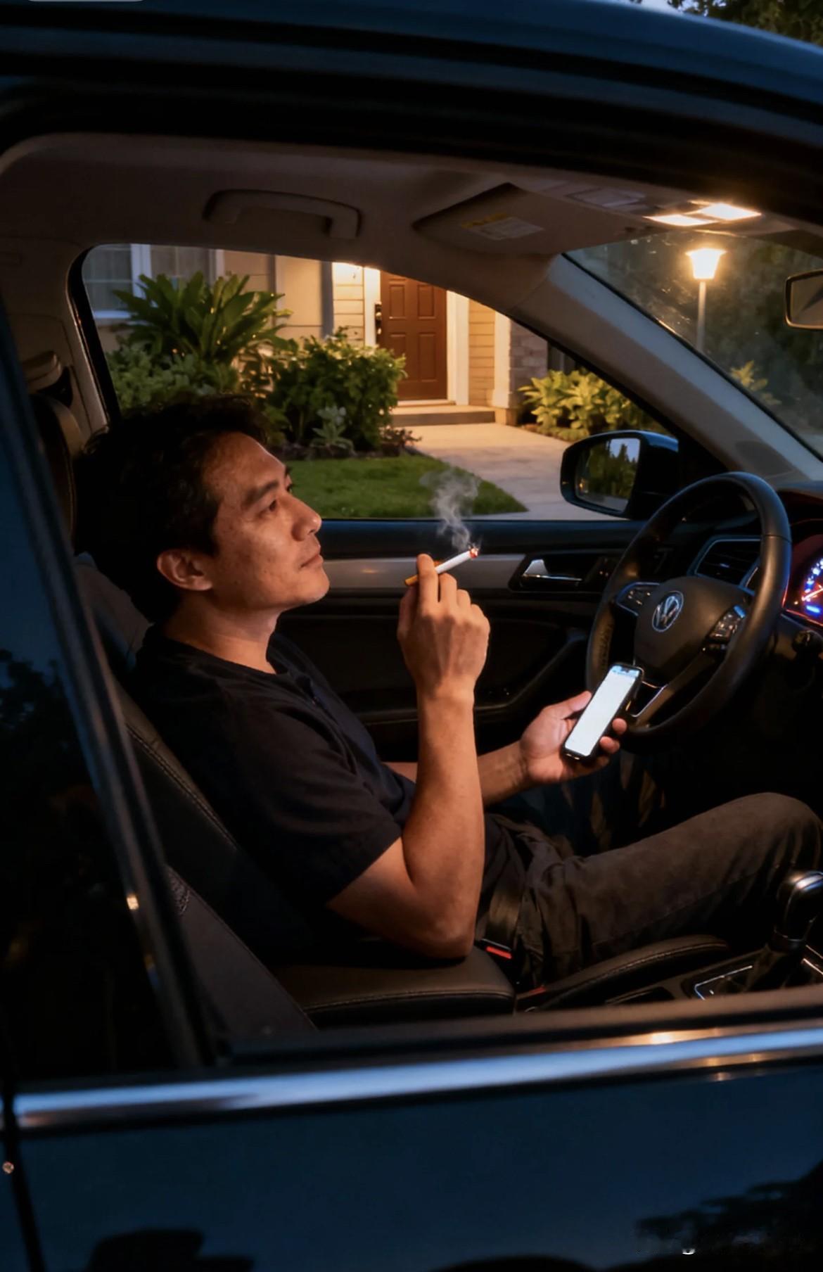 把车停稳在楼下,没有急着上去。调个舒服的座椅靠背,掏出手机划了划,顺手点上根烟,深吸一口——嘿,这才叫舒坦! 车窗留道缝,晚风裹着点草木香钻进来,烟圈慢悠悠飘出去。白天在公司忙得脚不沾地,这会儿终于没人催报表、没人喊开会了。指尖刷着手机,脑子放空,浑身的紧绷劲儿都散了。 这几分钟,不管是老公还是打工人的身份都先搁一边,就做回自己。 烟抽完,揣好手机,推门上楼,给老婆孩子一个精神满满的笑! 是不是男人都这样?