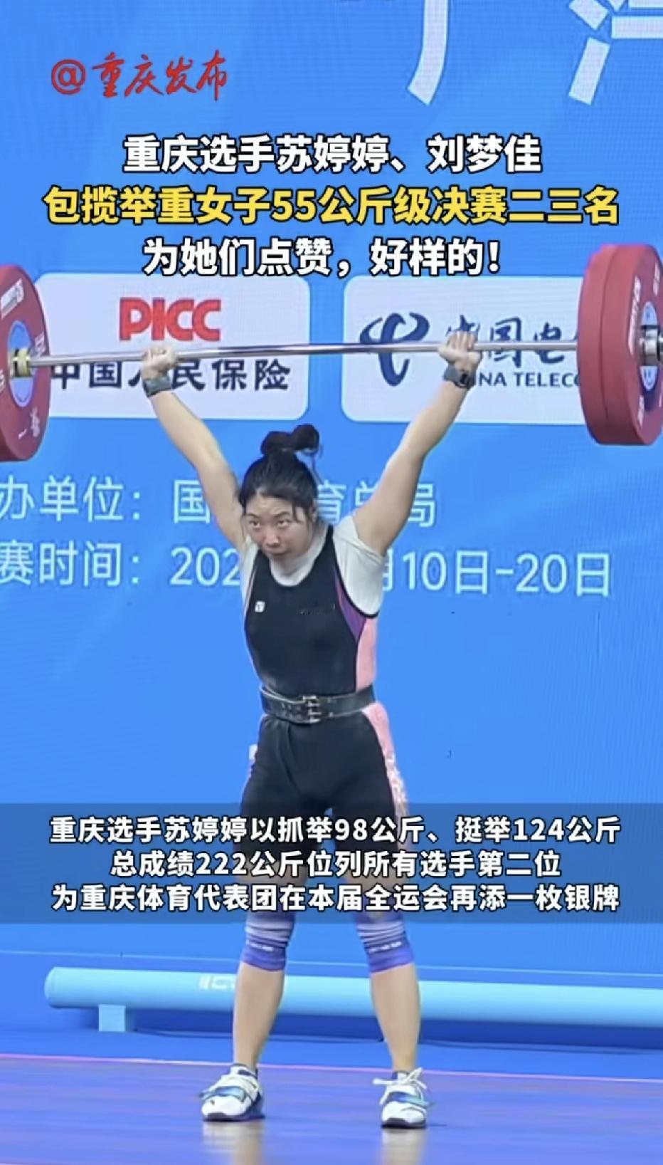 重庆女孩苏婷婷在十五届全运会举重女子55公斤决赛中以抓举98公斤、挺举124公斤,总成绩222公斤位列所有选手第二位,为重庆体育代表团在本届全运会再添一枚银牌,另一位重庆选手刘梦佳夺得铜牌,恭喜她们!(图片来源于网络侵删)
