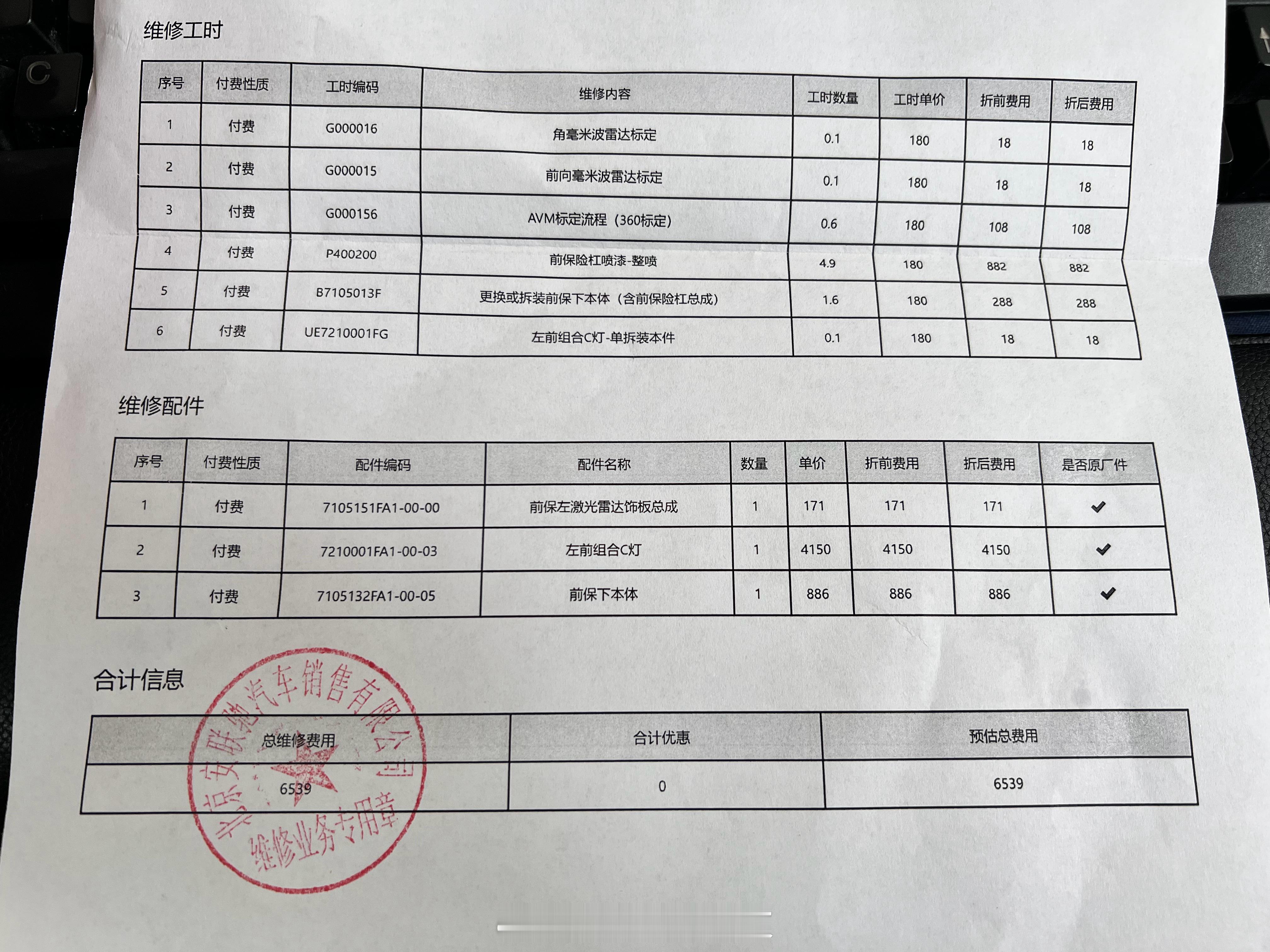 小鹏的大灯是真贵呀,一个灯4150元。今天开着G6出门,直行和拐弯的车剐蹭了,其实灯也没碎,就是明显划痕,一共6539元报价,其中一个大灯4150元。主要是对方全责但是想私了,这哪儿私了的起啊,还不如走个保险呢,想想要修车就头疼,太耽误事儿了