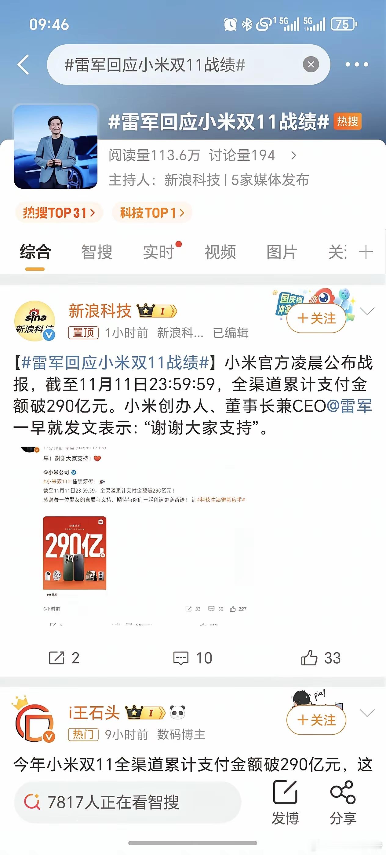 雷总再上科技榜热搜第一!因发了一句“谢谢大家支持”而上热搜,雷总这流量真牛