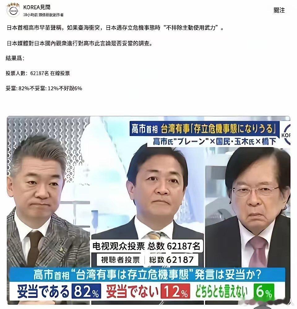 好事啊,日本这是想再次搞中日对决啊!最新民调显示有82%日本民众支持高市早苗的针对台海的言论:即在台海冲突时,日本遇存立危机事态时"不排除主动使用武力"。他们忘记联合国敌国条款了,就是中国这些安理会理事国认为战败国有纳粹死灰复燃的情况,可以不通过联合国授权就动武锄灭。这种情况下,我们可以认为日本再找借口对中国要进攻,那我们随时准备干死他们。想拿回琉球群岛,日本要介入台海那这次是一个好机会
