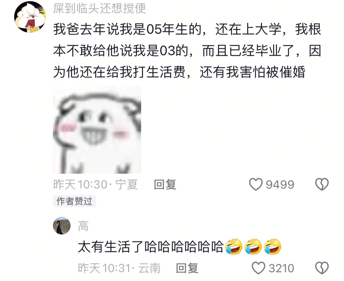 不敢跟他说我是03的,而且已经毕业了,因为他还在给我打生活费,还有我害怕被催婚