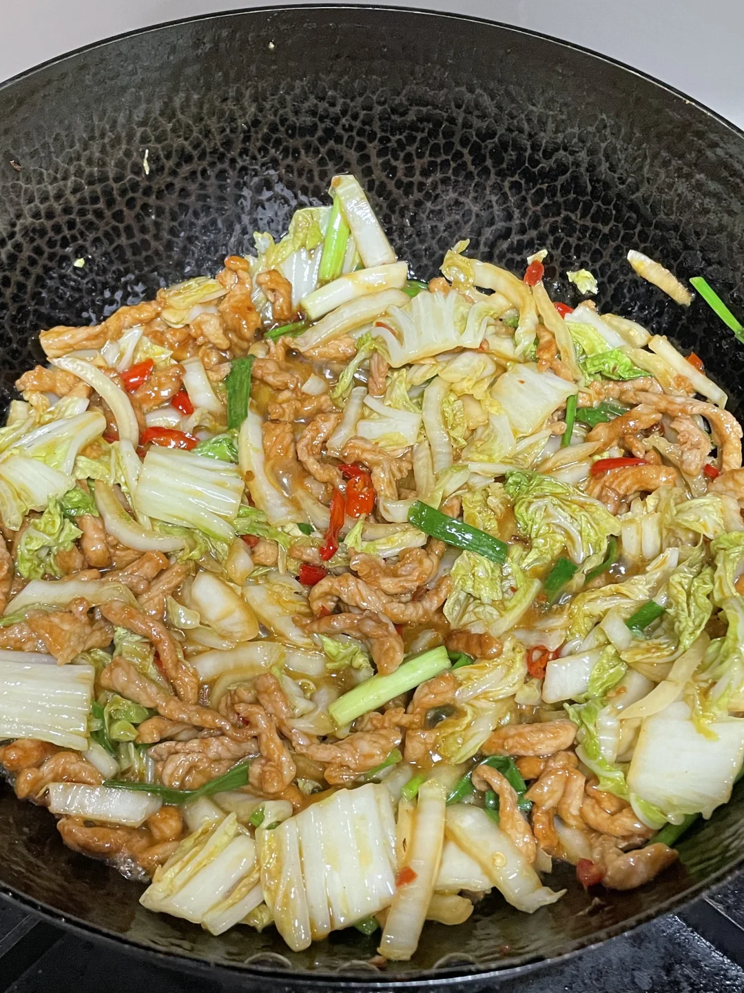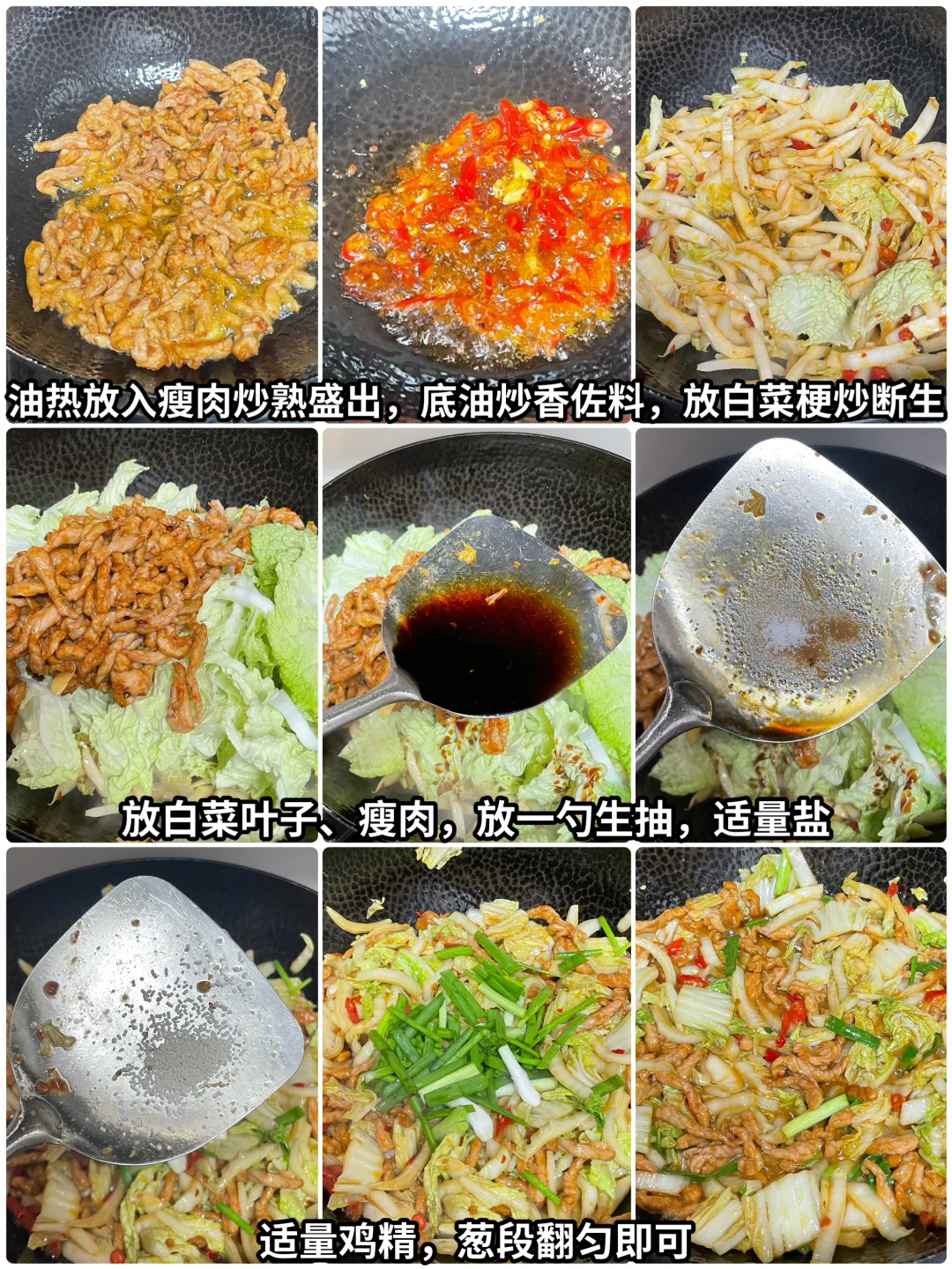 3⃣️起锅烧油,油热将瘦肉滑熟盛出。锅里的底油,炒香豆瓣酱,小米辣,花椒,蒜,放入白菜梗炒断生,再加入白菜叶子和滑熟的瘦肉,放1勺生抽和适量的盐进行调味。炒熟之后再放入适量的鸡精和葱段,翻匀即可出锅。