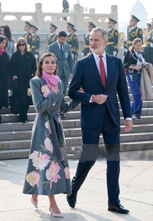 西班牙王后挽着国王老公的胳膊现身天安门广场!11月12日莱蒂齐亚王后盛装亮相北京
