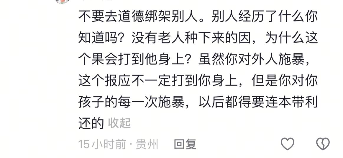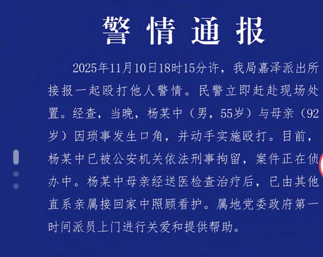 发生在江苏常州的,男子殴打93岁母亲事件,又迎来了新的进展! 就在11月12日,常州当地的帽子叔叔发布情况通报,涉事的55岁男子杨某中,已经被刑事拘留,而涉事的93岁老人,实则为92岁,在医院接受检查治疗后,被直系亲属接回了家中。对于这个处理结果,我是一点都不意外。因为无论是从人伦道德的角度出发,还是从法律的角度出发,男子的行为已经触及到了底线问题,所以对其从严从重的处理,是一点问题都没有。 可让我意外的是,是网友对待这起事件时的一些表现。昨天我有批判过这起事件,没想到在我的评论区,我竟然看到不少看似理性,实则很冷漠的言论。有人说,未知全貌,不予评论。有人说,先不着急,让子弹飞一会。还有人说,未经他人苦,莫劝他人善。这些都还算是正常的。更让我无法接受的是,竟然还有网友在替打人的男子辩驳。 说种什么因得什么果,你对孩子的每一次伤害,未来一定会报复在自己身上。你年轻的时候对孩子施暴,等你老了他就会以,你当初对待他的方式,来对待你。言外之意就是,老人之所以会被儿子打,很有可能是年轻的时候,她以同样的方式来打儿子。说真的,我真的不知道什么样的家庭氛围,才能让她说出如此的言论。 我不知道这老人,她年轻的时候,是以何种的方式来教育孩子。咱就假设一下如果咱们是当儿女的,小的时候被父母给打了,等到父母老了都快走不动了,咱们会一言不合,就扇耳光,撕扯头发吗?把他们摔倒在地上吗?我想99%的国人都不会如此做的。因为我们所接受的教育不允许,因为我们内心的善良不允许。我们顶多是会选择远离,而不会主动去伤害。 所以这位男子的所作所为,已经是泯灭了人性,但凡是一个正常的人,在看到视频中老人被打的那一幕,都应该会觉得愤怒,都忍不住地想要谴责!可现实却是,仍有一群自以为客观的人,在讲着冰冷的话语,甚至还在为打人者找理由,真的是挺可悲的!谁都会有老的一天,我只希望咱们这代人老的那一天,要是被欺负了,还能有人仗义执言。