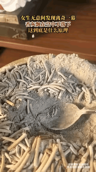 “彻底解释不清了!” 江苏女子烧香后惊见离谱一幕: 烧完的香灰竟飘在空中不落, 用勺子碰完松开还能重新悬浮! 本来想清理香炉的她, 被这场景吓了一跳。 网友们脑洞大开, 有人说藏着看不见的蜘蛛丝, 有人猜是拍摄角度造假, 还有人调侃“香灰成精”。 其实哪有那么玄乎, 大概率是香灰极轻, 加上香炉残留热气形成微弱上升气流,才出现的物理现象。 很多看似神奇的画面, 背后都是没留意到的科学细节。 你见过这种诡异场景吗?香灰处理技巧 香灰注入 檀香香灰