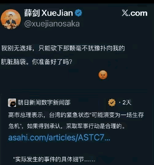 日本人如果不懂薛领事的话,他们的头颅终有一天会掉下来!薛领事的话有三层含义,第一层含义就是台岛是红线的红线,日本不能碰。第二层含义就是如果日本敢介入,他们就是豺狼,朋友来了有好酒,豺狼来了有猎枪。第三层含义就是如果日本敢介入,结果就是掉脖子。日本准备好了吗?高市准备好了吗?