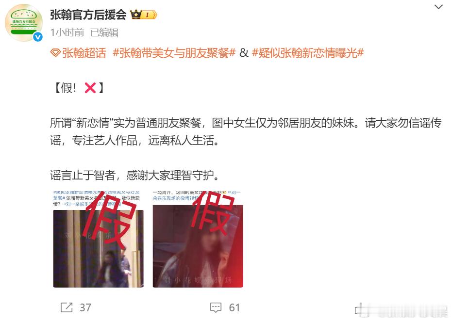 近日,张翰被拍到带新美女去跟朋友聚会,结束后两人一起离开,。对此, 辟谣道:“所谓‘新恋情’实为普通朋友聚餐,图中女生仅为邻居朋友的妹妹。请大家勿信谣传谣,专注艺人作品,远离私人生活。”