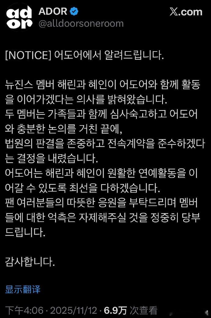 据韩媒,ADOR于12日宣布:“NewJeans成员Haerin和惠仁已表明将继续与ADOR一起进行活动的意愿”,并表示:“两位成员在与家人深思熟虑,并与ADOR进行了充分讨论后,决定尊重法院的判决并遵守专属合约。”