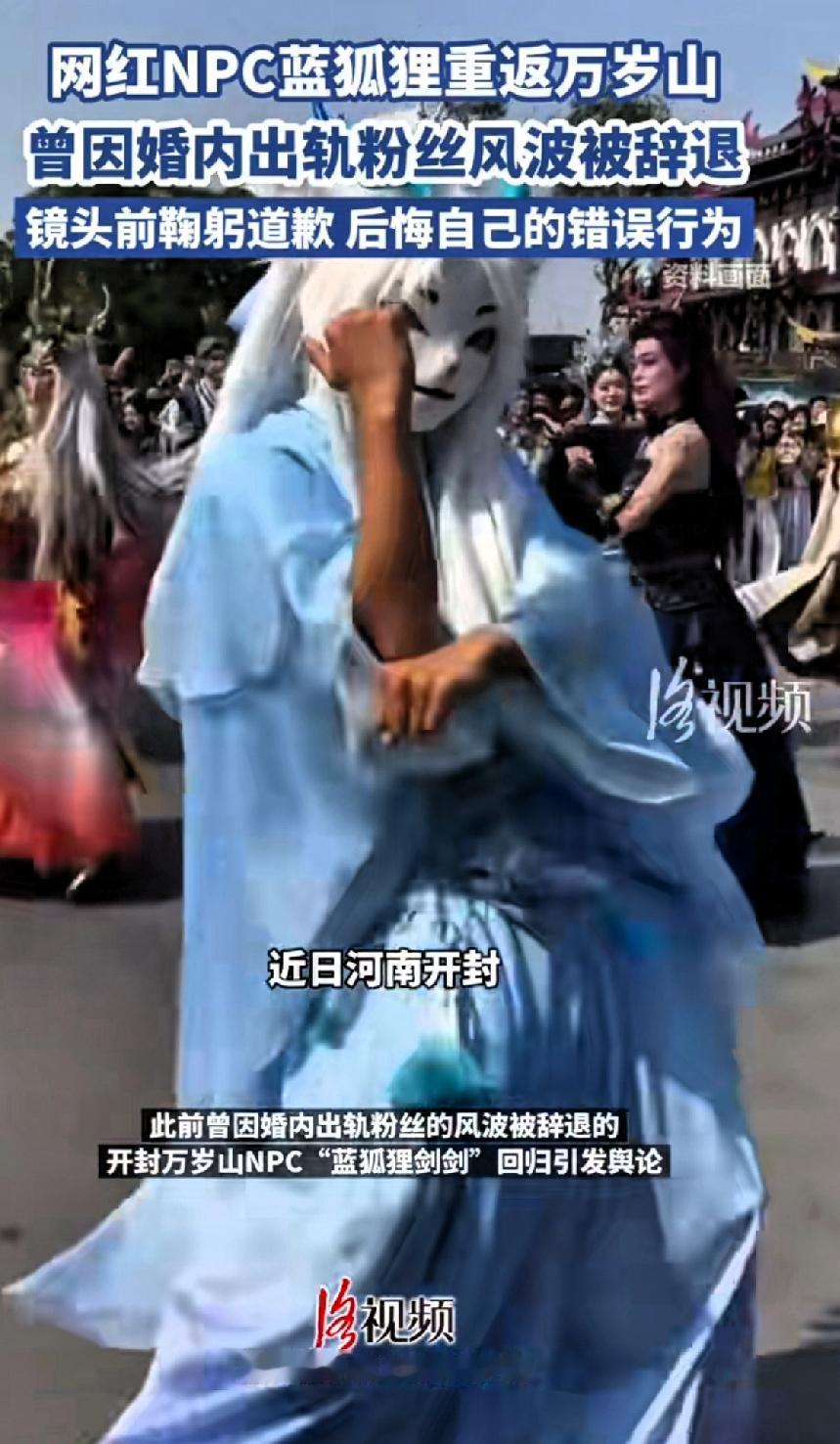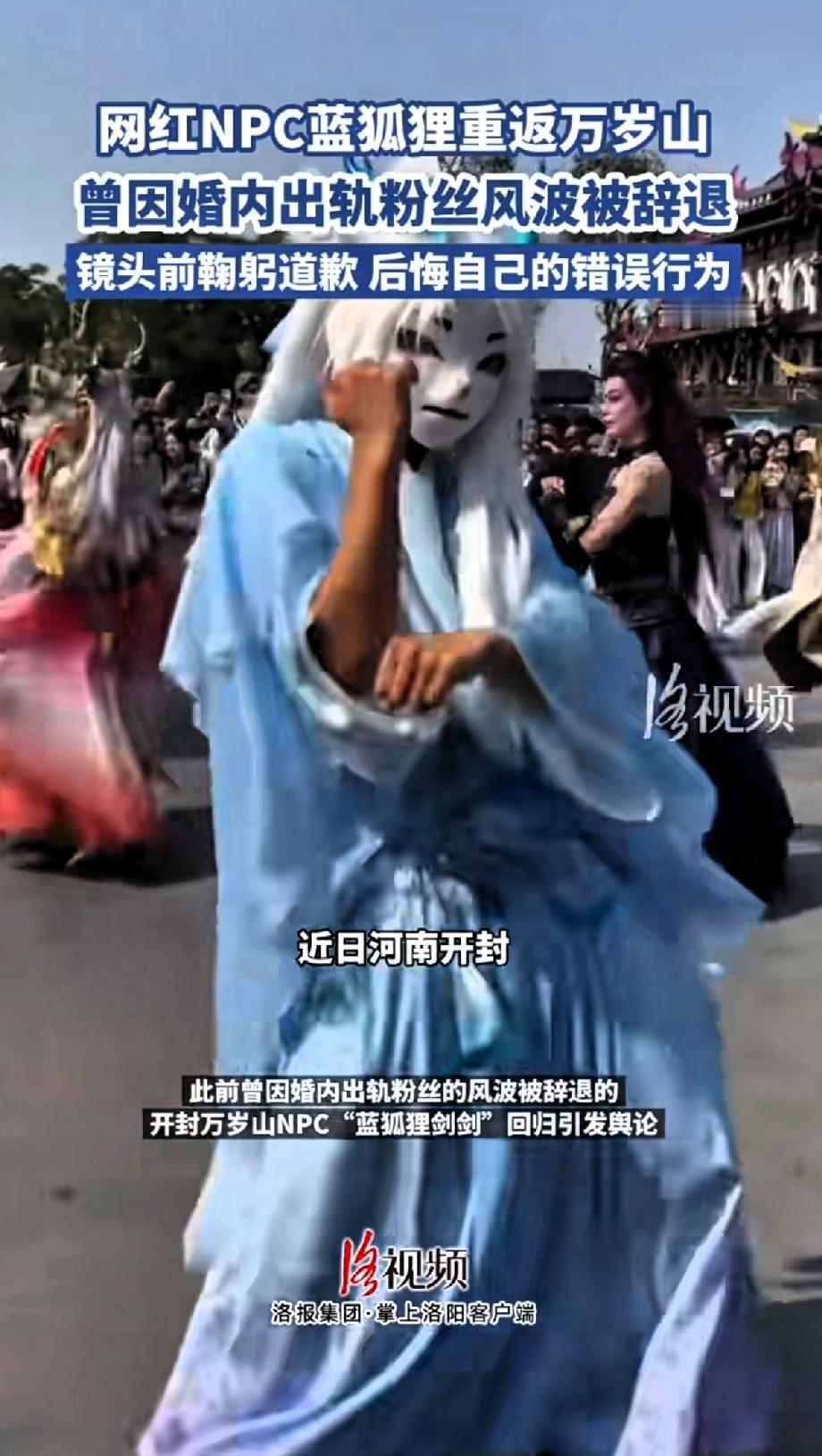 网红NPC蓝狐狸重返开封万岁山,蓝狐狸扮演者“剑剑”随着妖娆的舞姿走红网络。 后来开启直播,在直播过程中和榜一大姐为其花费大量金钱,二人约着私下见面榜一大姐曾询问他是否单身? 这个蓝狐狸的扮演者“剑剑”为了钱财居然再三表示自己是单身,随后二人线下见喝酒“发生关系”。 最后事情闹翻大了被妻子发现背叛婚姻,这个男人居然还在为自己“狡辩”,称对方只是询问自己的感情经历,并没有问自己是否结婚! 事情曝光了这个“剑剑”还在抠字眼试图推卸责任。事发后景区开除了他。 随后他发道歉视频,镜头前4次鞠躬致歉,表示自己触犯了道德底线,伤害了家人,不该欺骗喜欢他的粉丝。 现在又传出“蓝狐狸”已经回到景区继续演出。 而景区给出的答案是;对其多次考察和沟通后决定让他重新回到岗位继续表演。景区主要关注员工的工作表现,对其私生活难以介入处理。 蓝狐狸本来靠着妖娆的舞姿为景区引来不少流量,才刚刚爆火就被金钱和美色引诱,做出这样难以启齿的事。 其实演员摘下头套谁还认识你,大家喜欢你还不是因为顶着“蓝狐狸”的头套才有了流量,跳舞跳的比你好的大把人在,带上“蓝狐狸”的头套谁都可以。 希望这次回归能够踏踏实实的工作,也提醒一下其它走红的网红,不能有点流量就飘到云彩眼里。 大家只是喜欢正能量的人物,不要把粉丝当成傻子。粉丝喜欢网红也要考察清楚,不要人财两失。