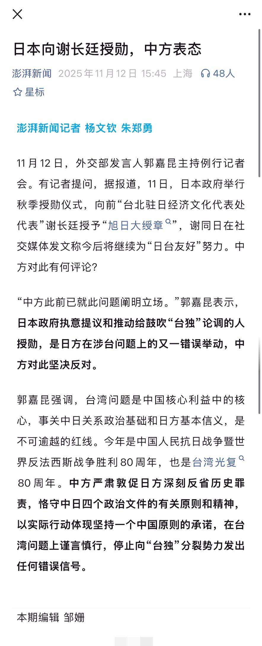 日政府授勋谢长廷,这事又大了! 真是一波未平 一波又起!11日,据报道,日本政府举行秋季授勋仪式,向前“台北驻日经济文化代表处代表”谢长廷授予“旭日大绶章”。谢长廷同日在社交媒体发文称,今后将继续为“日台友好”努力。 谢长廷“台独” 分子、台湾地区领导人赖清德办公室“资政”。谢为了个人利益,经常做出奸诈、投机取巧的事。在两岸议题上多次对中国大陆口出恶言。张口闭口“爱台湾”,实际上净干伤害台湾的事。公然美化日本殖民统治,歪曲历史真相,更在日本核污染水排海问题上站台背书,其“媚日谋独”的嘴脸昭然若揭。 由此可见,这分明就是狼狈为奸。日本这两天是真能给中方整活儿啊,还尽在台湾问题上整。高市早苗上台以来,尾巴撅的老高,就没消停过。 不过,这样也好,也让那些主张中日友好的人士看看日本是个什么货色!现在不怕它乱来,就怕它不来,她整的越大,我们回击就越放得开。反正开打后,我们是真不介意第一时间就敲碎小日子的天顶盖!