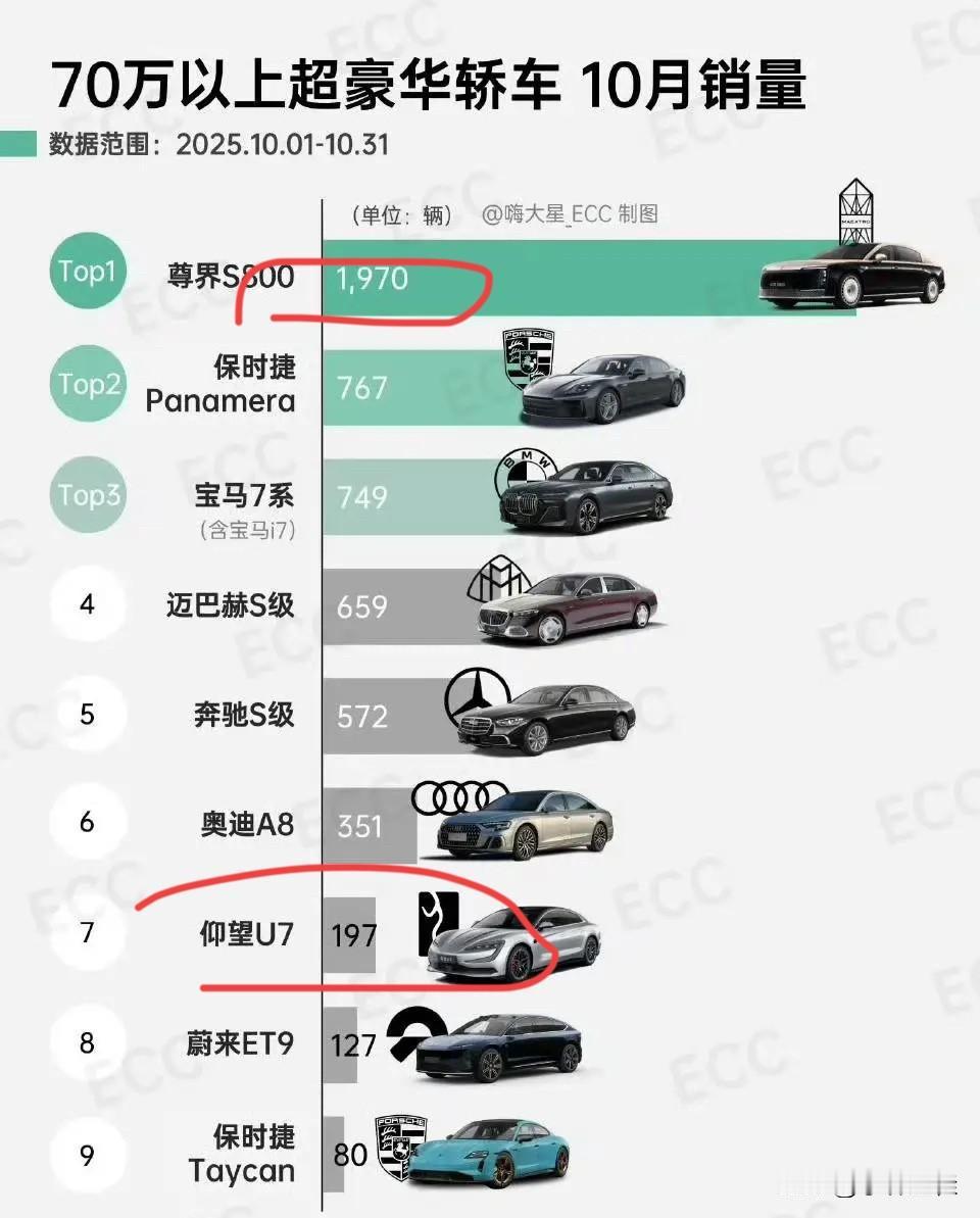 尊界S800:“我售价70.8万-101.8万,我10月销量1970辆!” 仰望U7:“我售价62.8万-70.8万,10月销量197辆!” 话说,就尊界S800这销量,估计比亚迪看了,也会眼馋吧?虽然仰望U8有过最高月销1600的纪录,但那是SUV车型创下国产百万级纪录! 关于轿车,仰望明明可以用一款“鼎”字脸的行政版可以去分一杯羹,结果为了展示性能,硬生生的错失了这个机会!这其实应该算是战略“失误”? 最后,还是得再夸一夸华为的影响力,那是真的牛![赞]