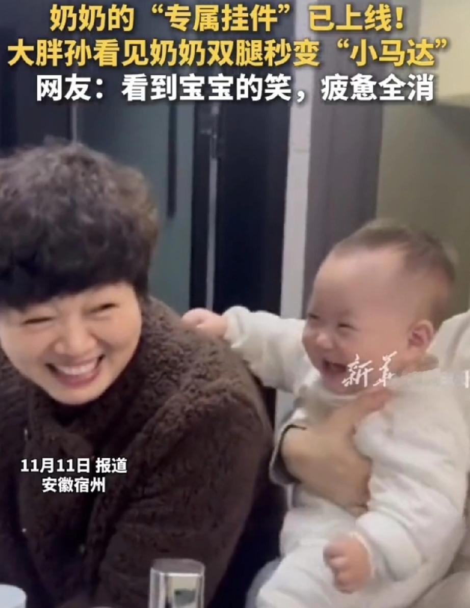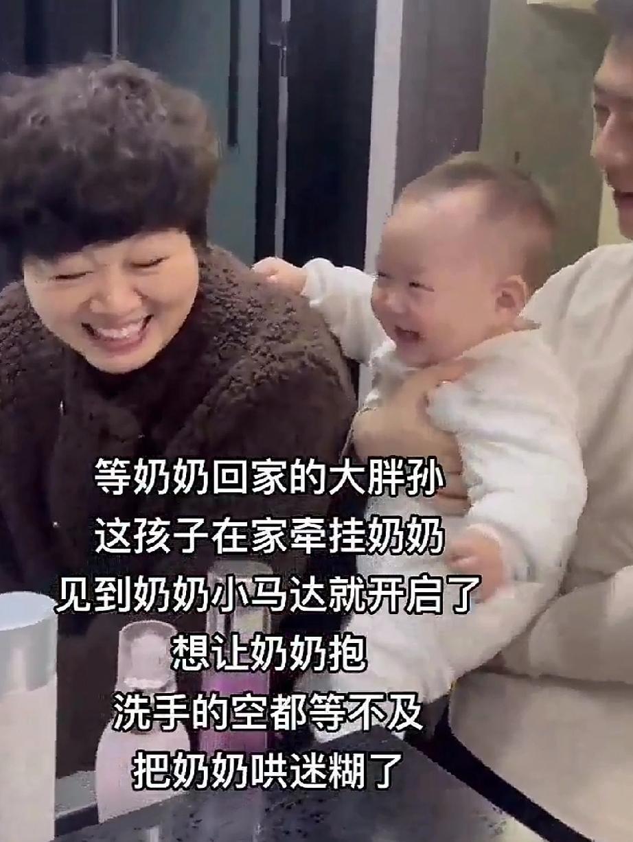 11月10日,安徽宿州。已经是晚上10点钟了,奶奶出门还没回来。平时8点钟就睡觉的9个月的宝宝,仍然不肯睡,两只眼睛睁的滚圆。宝爸无可奈何的坐在沙发上哄孩子睡,宝宝则一直往门口张望。 门口忽然打开一条缝,伸进来一张脸。宝宝一看,那是奶奶,顿时兴奋起来,咯咯咯笑个不停,拼命向前求奶奶抱。 奶奶回到家里先洗手,宝宝一刻也等不及了。宝爸把孩子送到正在洗手奶奶面前,宝宝更是高兴的不得了,手舞足蹈的,双腿舞动的更像开足马力的“小马达”。奶奶看见大胖孙子这么挂念自己,直接被哄迷糊了。 宝宝的父母平时工作忙,孩子交给奶奶带。和奶奶接触的多,也就和奶奶更亲,孩子习惯了奶奶哄自己睡觉,换了一个人反倒睡不着了。难怪宝宝见到了奶奶,就像看见了大救星。 宝宝看见奶奶双腿秒变“小马达”祖孙情