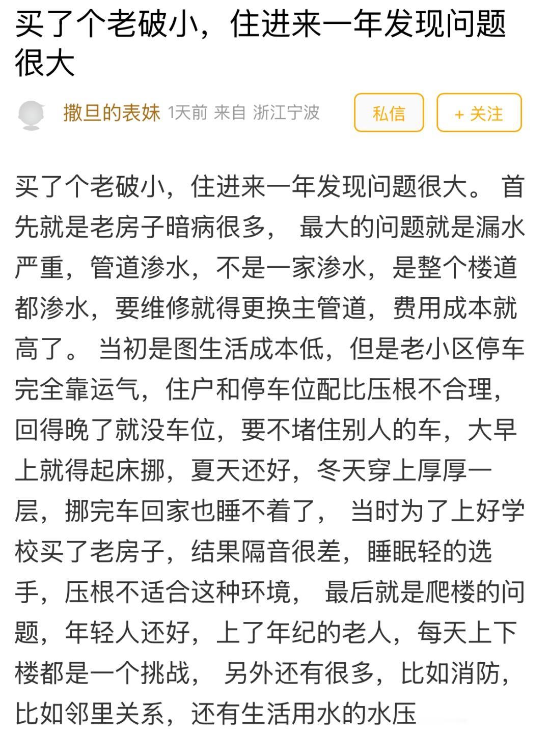 糟心!宁波业主买下老破小,入住一年后发现暗病很多! 该业主称当初选择老小区,除了生活成本低,还有一个重要原因就是觉得离学校近,方便孩子上学。可入住后才发现,老小区的停车问题简直是一场噩梦。小区的住户和停车位配比严重不合理,车位少得可怜。每天下班回家,停车完全靠运气。诸如种种,该业主觉得老房子的暗病就像隐藏在暗处的“定时炸弹”,随时可能爆发。