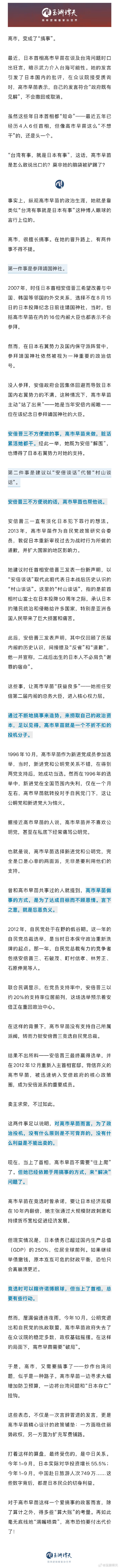 【 】 高市,最近在台湾问题上搞事。这让人不禁想问,“台湾有事,就是日本有事”,这话,高市早苗是怎么敢说出口的?莫非她的脑袋被驴踢了?事实上,纵观高市早苗的政治生涯,有几件事是不得不提的。1.2007年,高市早苗是当年安倍内阁唯一一位在该纪念日参拜靖国神社的大臣。安倍晋三不方便做的事,高市早苗来做,脏活累活她都干。经此一举,她既为安倍“解围”,也博得了日本右翼势力对她的支持。2.建议以“安倍谈话”代替“村山谈话”,淡化日本犯下罪行。安倍晋三一直有这样的想法,安倍晋三不方便说的话,高市早苗也帮他说。3.靠着新进党和公明党成功当选,仅在一个月左右,就转投对手自民党门下。曾和高市早苗共事过的人就提到,高市早苗做事的方式,是为了达成目标而不顾恩情。言下之意,就是忘恩负义。4.在选举中,高市早苗没有支持自己所属派阀,转而力挺安倍晋三竞选自民党总裁。安倍晋三最终赢得选举,并在2012年12月重新入主首相官邸。背信弃义的高市早苗,被迅速纳入安倍政府的核心政策圈,成为安倍派系的重要成员。卖主求荣,不过如此。这两件事足以说明,对高市早苗而言,为了政治投机,没有什么原则是不可背弃的,没有什么利益是不能出卖的。对于高市早苗这样一个爱搞事的政客而言,除了算计之外,得多些“算大账”的考量。再如此毫无底线地“满嘴喷粪”,高市恐怕要付出代价了!(玉渊谭天)