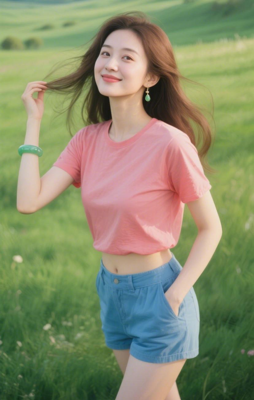 夏日清新穿搭,粉色短袖搭配蓝色短裤,草地上自由奔跑,享受阳光和微风!🌞💚🌿