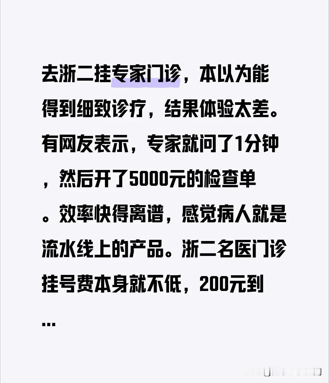 去浙二挂专家门诊,本以为能得到细致诊疗,结果体验太差。有网友表示,专家就问了1分钟,然后开了5000元的检查单。效率快得离谱,感觉病人就是流水线上的产品。 浙二名医门诊挂号费本身就不低,200元到1000元不等,不同科室和专家级别收费有差异。像心血管内科、神经外科这些热门科室,费用更高。可这1分钟问诊,实在让人怀疑这高价挂号费和检查费花得值不值专家预约挂号 浙一医院 浙二看病 浙二医院 新浙二医院 浙江门诊 浙大二医院