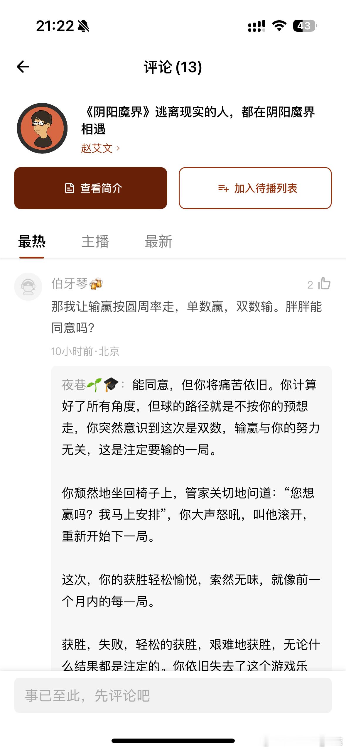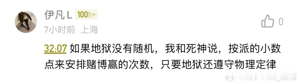 黑水的听众太人才了!!!这期《阴阳魔界》有个故事,在地狱里一切都是安排好的,赌博、抢银行都不会再是随机事件。恶魔胖胖会提前问你要输几次赢几次。导致一切变得无聊而痛苦。于是有了以下评论!