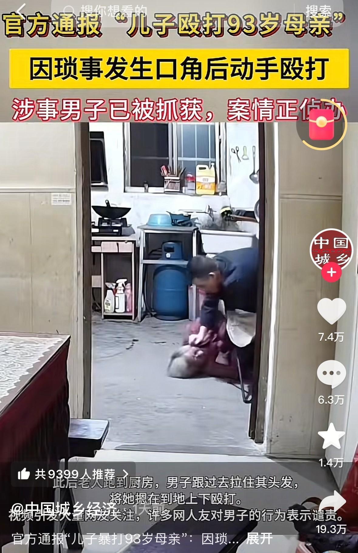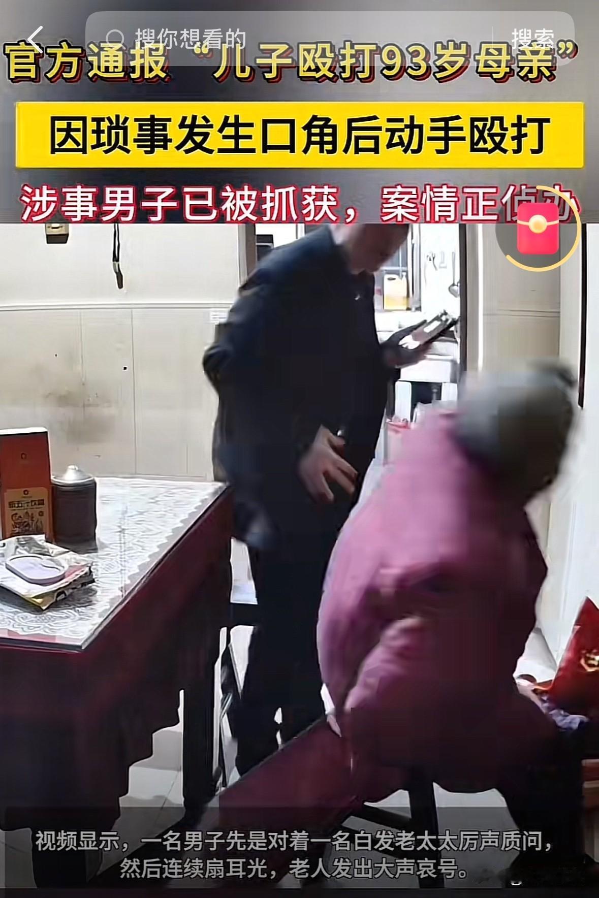 “扇耳光、撕头发、按在地上打……” 我想问问你怎么这么狠呢? 这个殴打93岁母亲的男人已经55岁了,打母亲的理由是什么,不管什么理由都不能动手吧?男子先是对着母亲猛扇耳光,又撕扯老人的头发,最后老人逃到厨房,他还要跟过去把老母亲按在地上打她的头…… 哪个母亲生孩子来不是捧在手心养大的?谁能想到,老了老了,还得遭儿子的打,对老人来说,这已经不是纯身体上的痛,她更痛的是,养了一个这样的儿,这一生该有多么不甘。 看评论说,老人曾跟女儿说挨过打,女儿才悄悄安装了摄像头。这么大年纪了,自己毫无办法,年迈的她该有多么无助。 希望女儿快把母亲接走吧,跟这个恶子断绝关系,让年迈的母亲余生多一点温暖。