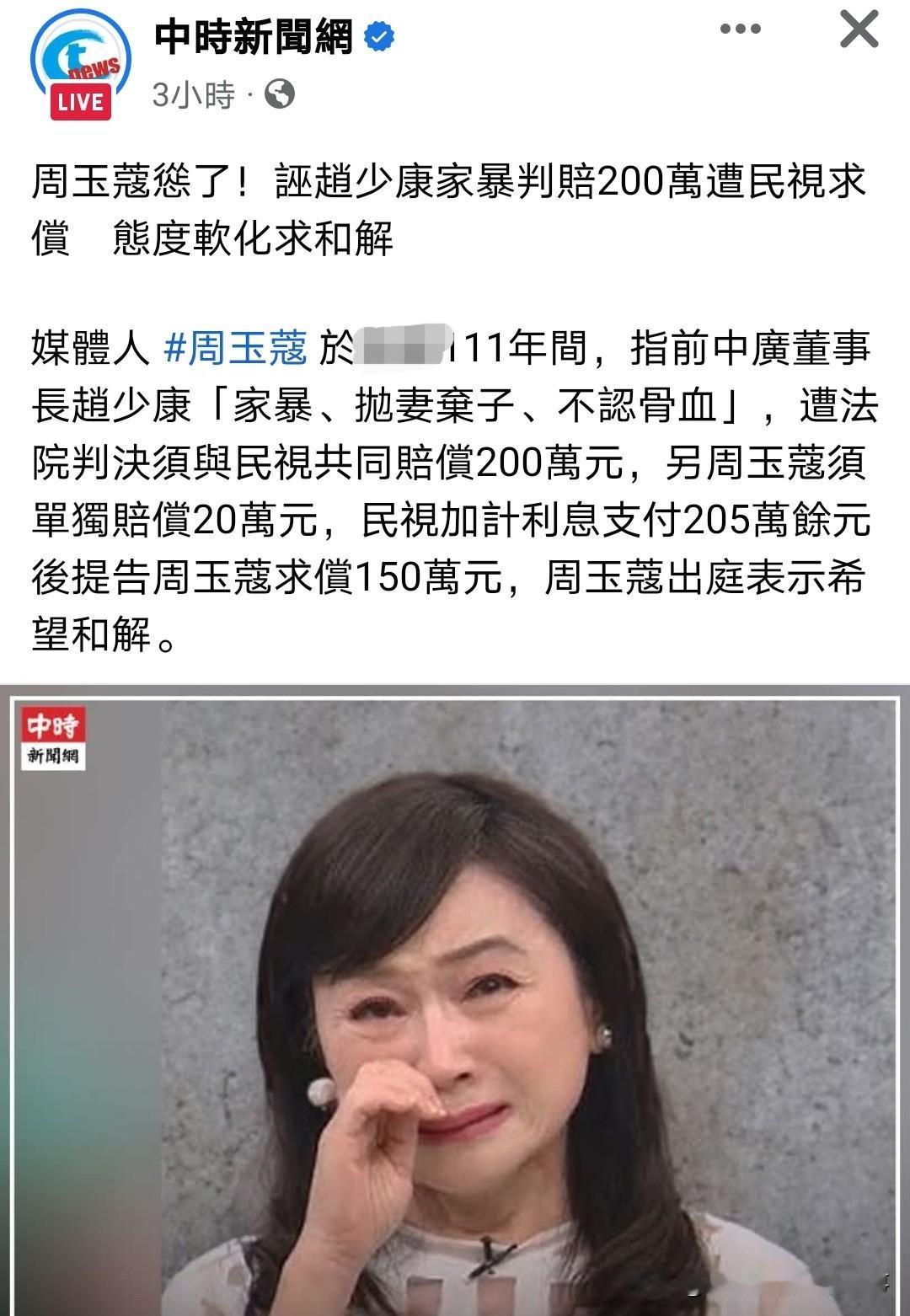 周玉蔻遭民视提告求偿150万!接连输官司,哭诉求和解! 最近台湾名嘴界的老谣棍周玉蔻祸不单行,因为造谣接连输官司!先是10月份因造谣污蔑中天电视案被台湾高院加码判赔320万,还要登报道歉!随后因造谣赵少康家暴、抛妻弃子诽谤案判赔220万(其中200万和民视一起负担、单独再加20万)。民视不想出这笔钱,提告周玉蔻求偿150万元!笑死了! 周玉蔻面对接连输官司,开始打悲情牌,求和解。