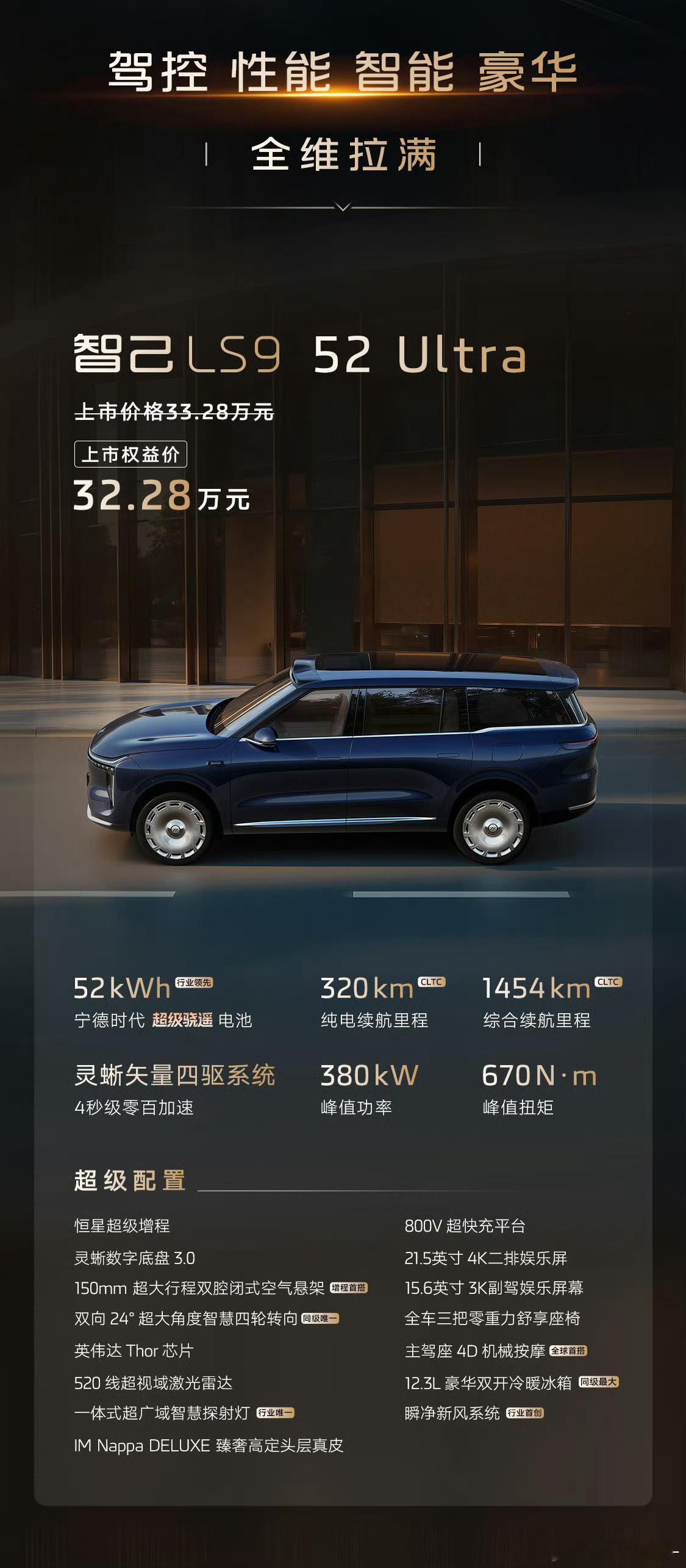 智己LS9正式上市,作为品牌旗舰大六座SUV,以极具竞争力的上市权益价32.28万-35.28万元登场,共推出52 Ultra与66 Ultra两款配置。配置上,全系标配“灵蜥数字底盘3.0”,整合了150mm行程闭式双腔空气悬架与双向24°四轮转向系统,这让车长超过5.2米的全尺寸SUV实现了仅4.95米的转弯半径。动力上搭载“恒星”超级增程系统,配备前后双电机,综合功率达390千瓦,配合66kWh电池组,可实现402公里的CLTC纯电续航与超过1500公里的综合续航。智能化方面全系标配520线超视域激光雷达及英伟达Thor芯片。座舱内采用2+2+2六座布局,配备三零重力座椅、多屏联动系统及B&O音响等豪华配置。如果单纯从售价和配置上来看,绝对算相当有竞争力,不过最近也看了很多网友吐槽的内饰用料做工还有第三排车窗线上提带来的内部视线压抑有购买计划的还是建议去线下看看实车