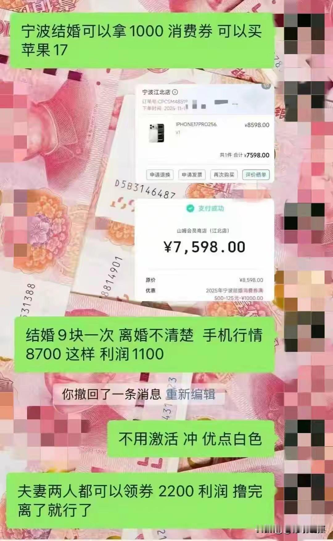 要不说浙江老板多呢,这头脑太厉害了,羊毛都薅羊到了民政局头上! 山姆会员商店购买苹果17,可以叠加使用2025年宁波结婚消费券-满500元减125元,原价8598元的手机花7598元就能购得。 攻略来了,有人大大方方贴出了寻求“结婚搭子”。两人假装情侣领证结婚,然后就可以领取结婚消费券,每个人1000元,两人总计2000元!消费券拿到了就去离!浙江鼓励地方发放结婚消费券 结婚消费券