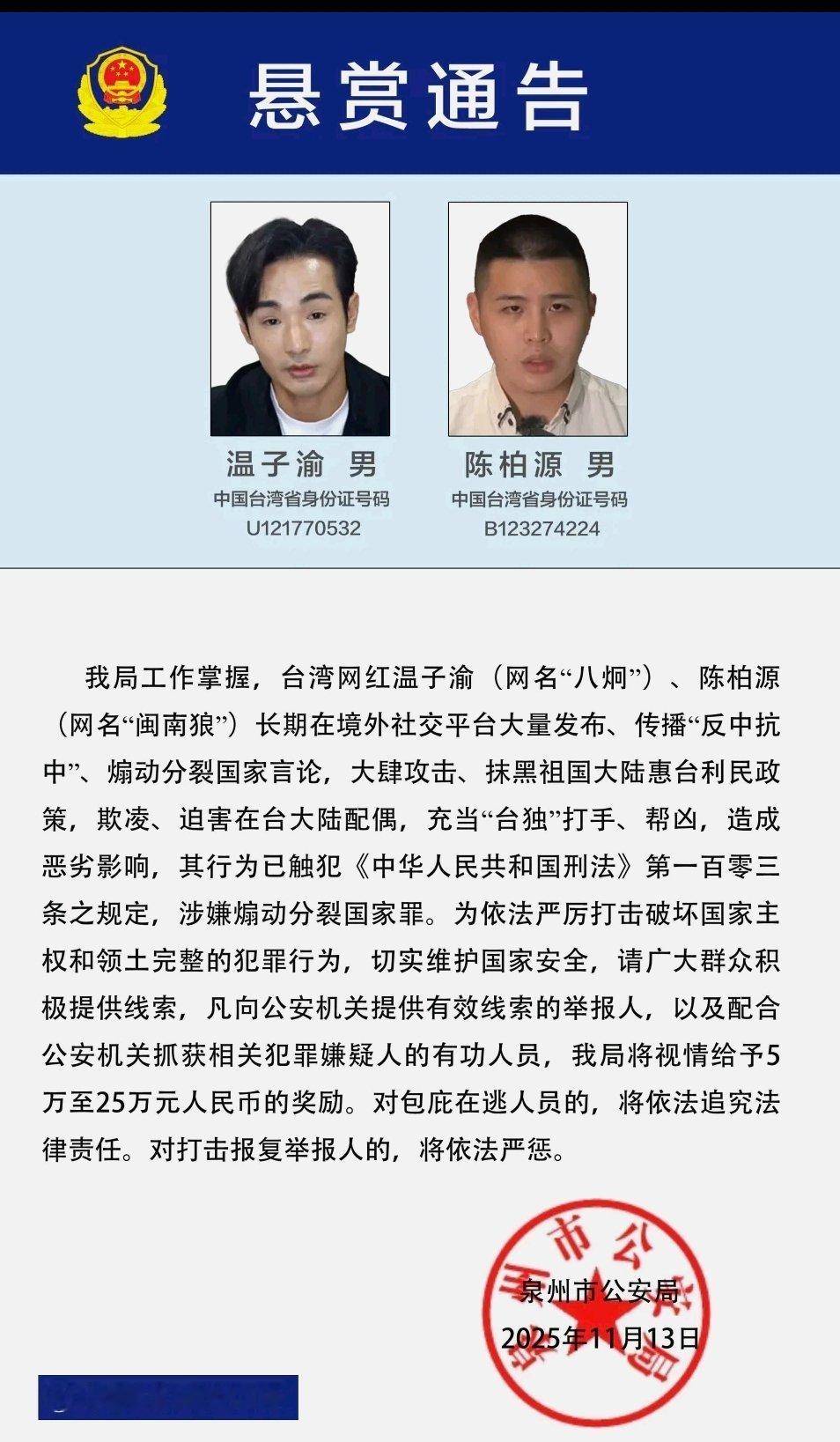 11月13日,福建省泉州市公安局发布悬赏通告,征集台湾网红温子渝(网名“八炯”)、陈柏源(网名“闽南狼”)违法犯罪线索。