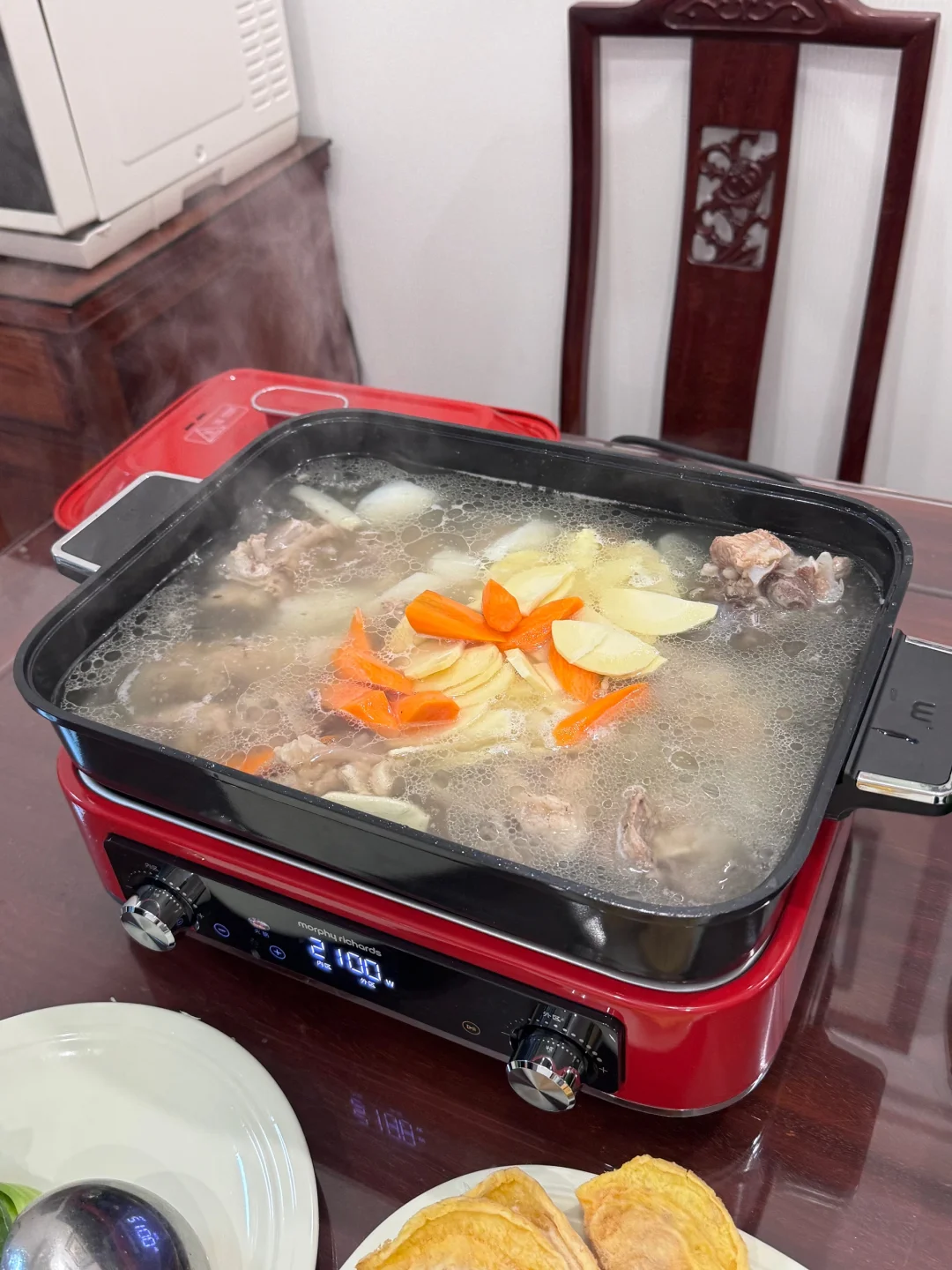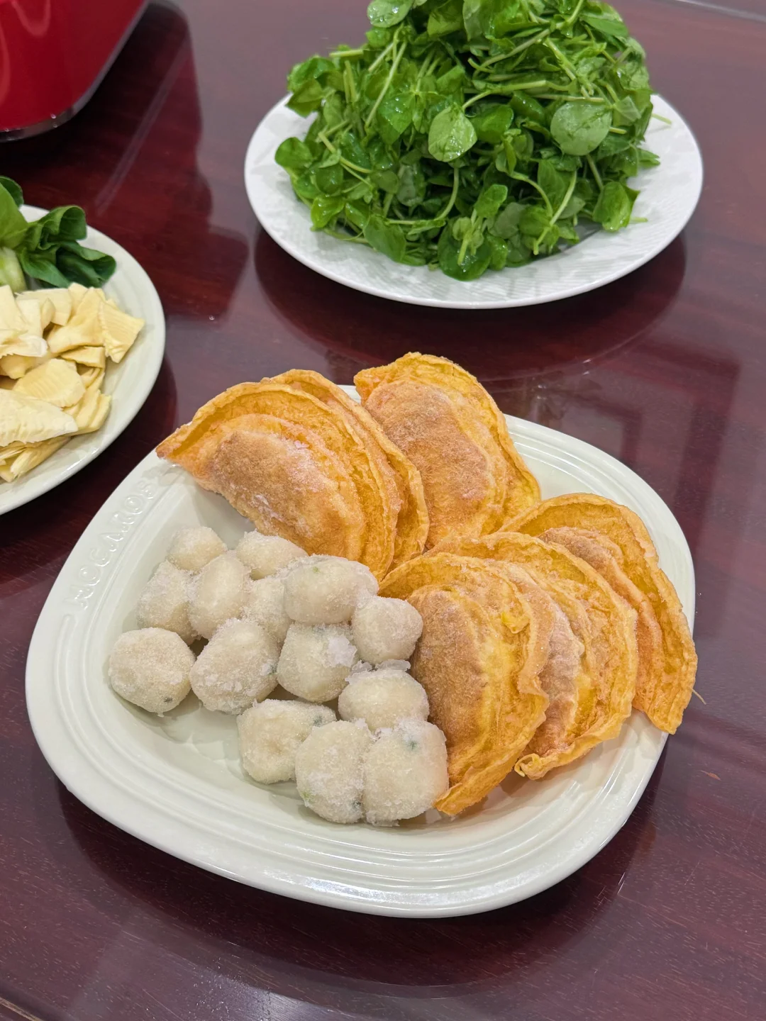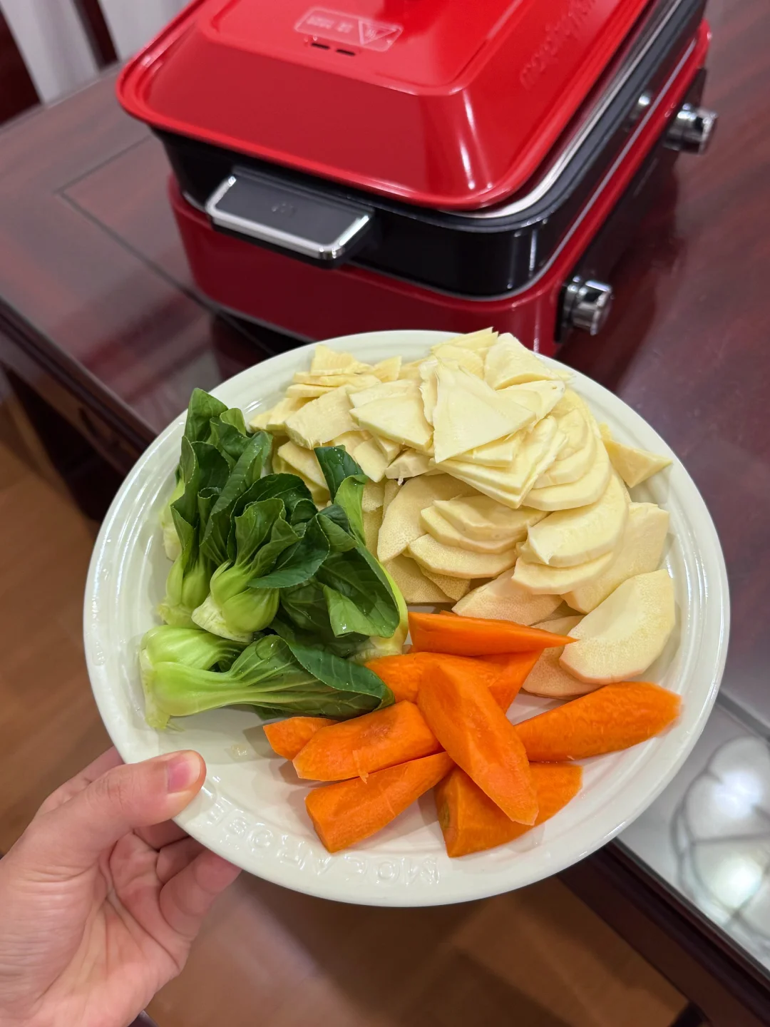 今天下班早 去菜市场转了一圈 现在菜比肉贵 看到有冬笋时鲜 36一斤 买了一点回来 还买了本地菠菜 青菜芯 豆苗 . 还买了筒骨 炖了汤底筒骨汤 涮点蛋饺 鱼丸 再来点时令蔬菜 100块搞定一顿晚餐 踏踏实实 比在外面吃舒服~