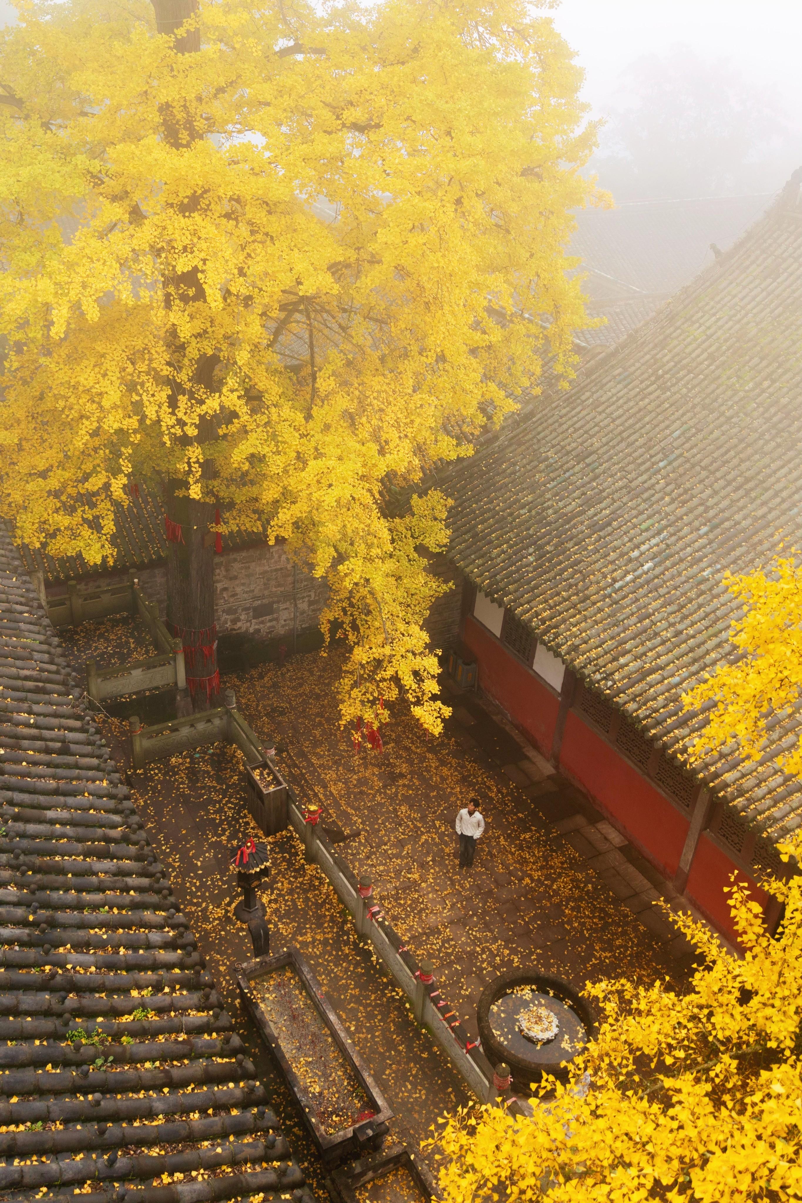 成都周边1小时❗️我被“满目鎏金”的银杏所震撼。没想到在成都我也找到了满目鎏金的银杏 千年银杏夫妻树也已经披上金色的华裳了 地址📍:成都金堂慈云寺 交通🚕:自驾前往1小时到达 𝙋𝙡𝙖𝙮 𝙨𝙩𝙧𝙖𝙩𝙚𝙜𝙮游玩攻略 1️⃣进大门就可以看见一颗超大的银杏树搭配红墙与浓雾,非常出片颜色也好看 2️⃣一直往里走穿过中殿后,可以看到俩颗大的千年银杏树这里也是最出片的地方,不管地拍还是航拍都非常好看 3️⃣可以一早前往,山上容易起雾!搭配黄黄的银杏树这里真的非常魔幻美丽 银杏观赏期:11