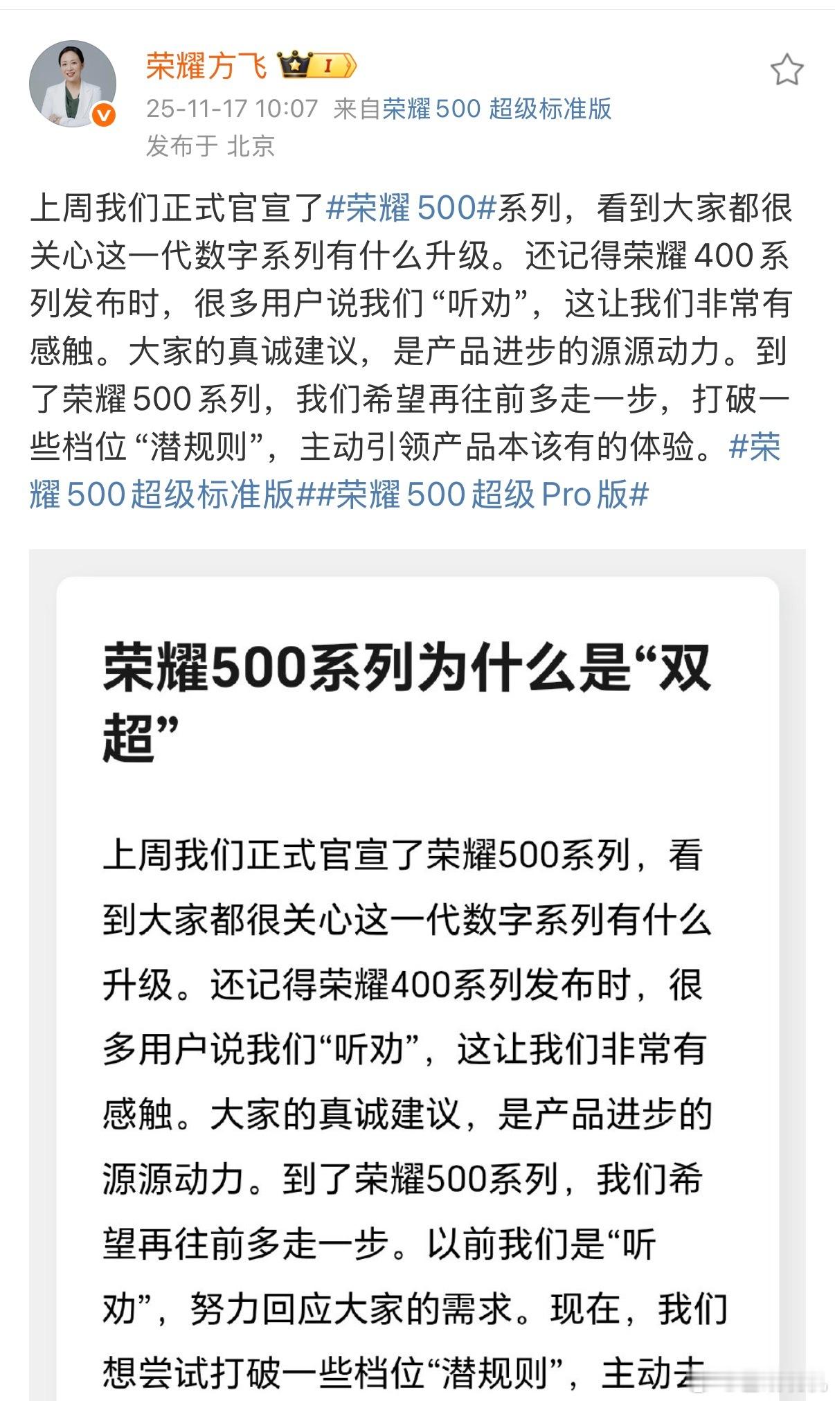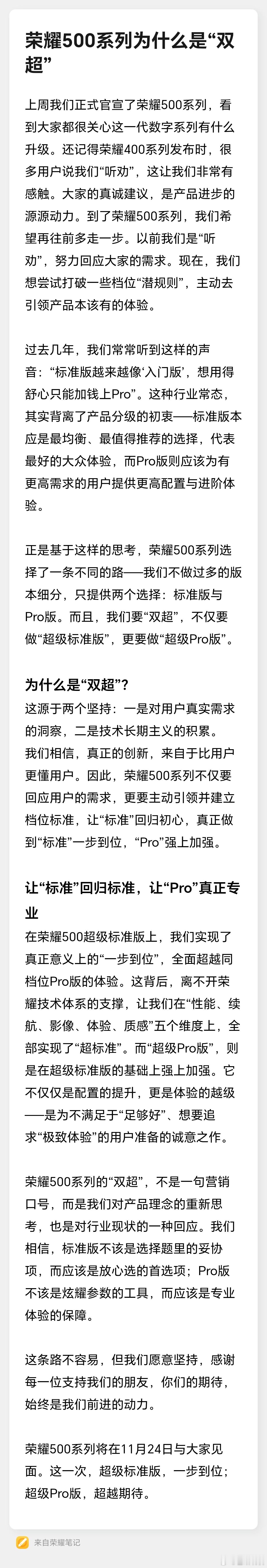 其实我也听到越来越多的人吐槽现在标准版缩水得严重,配置越来越入门,只能咬牙上Pro版。这次荣耀500系列提出了个概念,“超级标准版”和“超级Pro版”,标准版应该是最均衡的,而Pro是面向需求更高的用户,重点是更专业的体验。荣耀500系列全系都搭载了骁龙8旗舰芯,续航能力第一档位,外观也用上了一体冷雕玻璃,给我的感觉荣耀这次改变还挺多的,就看看荣耀500系列还能有什么惊喜了。