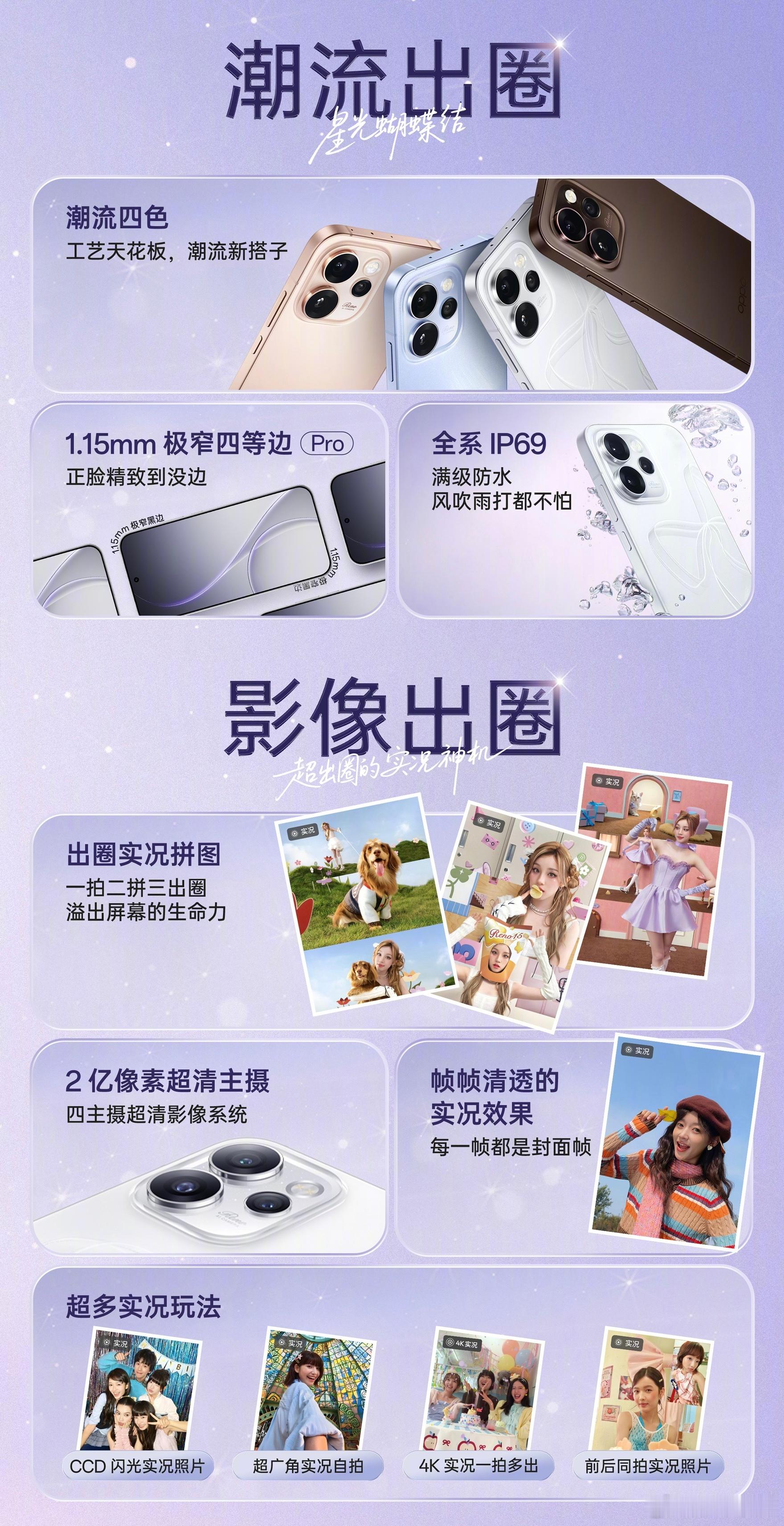 OPPO的Reno系列已经把潮流刻在基因里面了,这次的OPPO Reno15 系列最有意思的就是带来了星光蝴蝶结配色,裸眼3D效果的蝴蝶结纹理,挺让人眼前一亮的,再加上极窄边小直屏,手感方面也做得很不错。而在影像上也有了2亿超清主摄,还加入了很多潮流玩法,比如支持多张实况照片自由拼合的「出圈实况拼图」,CCD闪光实况照片,前后同拍实况照片,号称实况神机,感觉我这种中年潮流达人也挺适合的。