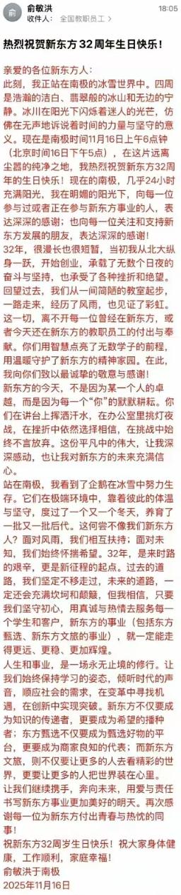 俞敏洪这次被全网怒喷, 不是因为他去了南极而员工还在加班, 也不是因为他那封全员信的内容,而是他 在总能做出不合时宜的错误决定,说出话也让常人难以理解。 在整封信中,有网友统计出,全文一共992个字,提了17次我和5次南极,信中写出了现在南极的环境有多好,写出了企鹅的努力生存,写出了自己的心情有多激动,可却对自己员工的贡献,只是空洞的大白话,毫无对员工的尊重。 老板可以吃肉,但不能连口汤都不给员工喝,更不能说一边说肉真好吃,一边让员工连闻一闻的权利都没有。 其实大可以,带几个成绩出色的员工一起去南极,每个人都写一封信,让员工们知道跟着你是有机会吃肉的,而不是用矫揉造作的语言,向打工人们强灌无用的鸡汤。