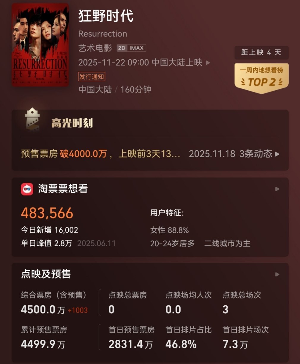 4500啦!!鸟毛牛逼!!!明天继续向更高的目标冲!!要送给玺最好的生日礼物!!要让这个金鸡影帝每一部主演电影预售都破亿!!关关难过我们关关过!