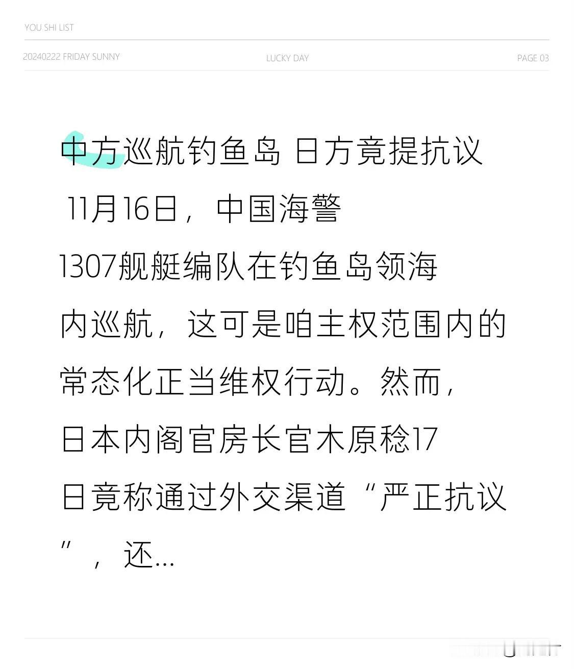 中方巡航钓鱼岛 日方竟提抗议 中方巡航钓鱼岛,日方无端抗议 11月16日,中国海警1307舰艇编队在钓鱼岛领海内巡航,这是中国在主权范围内开展的常态化正当维权行动。然而,17日日本内阁官房长官木原稔竟通过外交渠道“严正抗议”,还妄称中方行动“侵犯日本主权”,实在无理取闹。 钓鱼岛及其附属岛屿是中国固有领土,中方巡航合理合法。此次巡航也是对近期日方一系列涉华挑衅的反制,此前日本首相高市早苗多次发表涉台错误言论。日方此举不过是转移视线的政治操弄,部分日本学者都称其是“国内政治需要”。中国维权脚步不会停,日方抗议无效! 中日主权争端 海警巡航台湾岛 中日海域争议