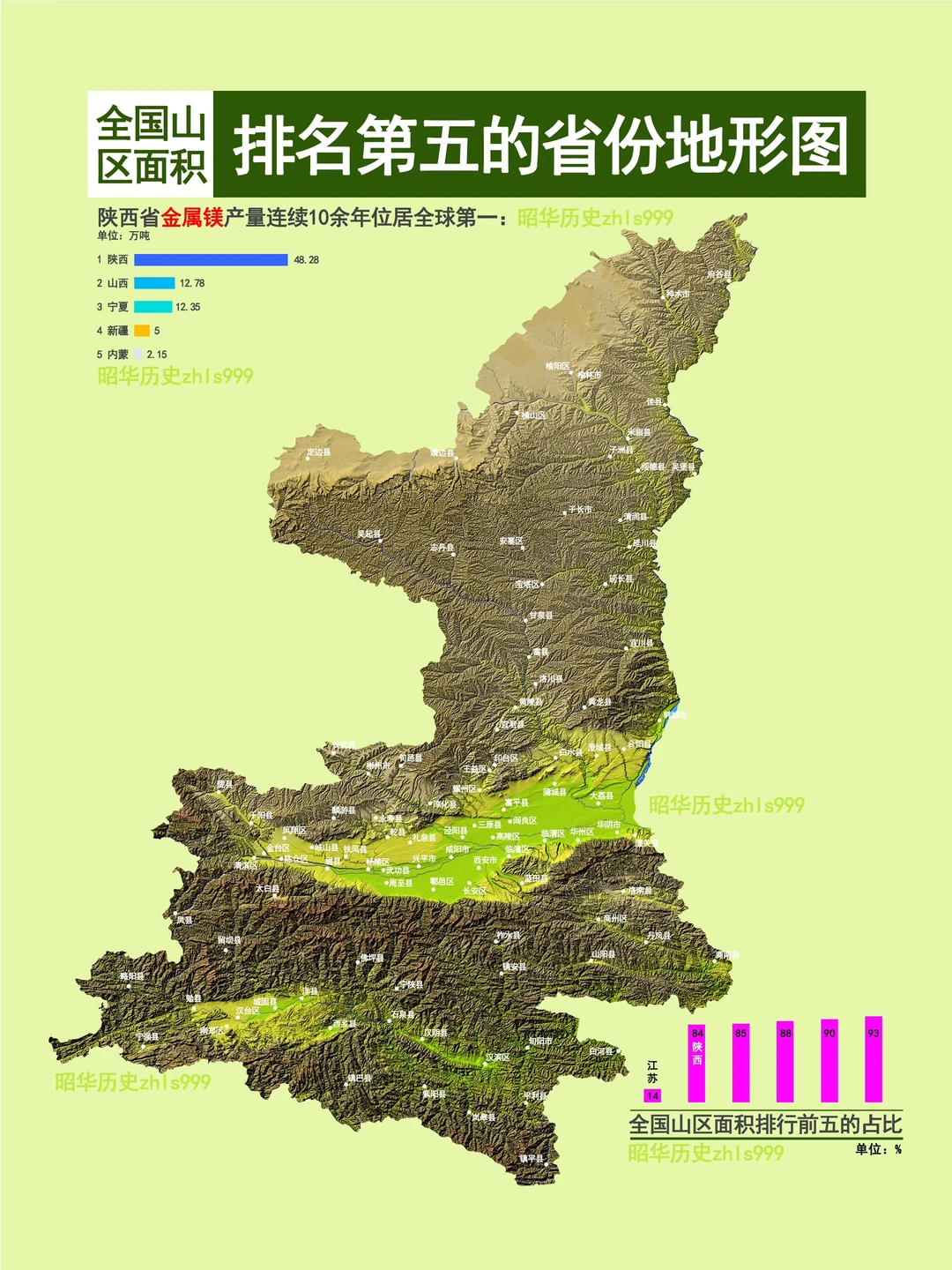 陕西省主要由黄土高原、秦岭和关中盆地组成,地势呈中间低、南北高的特点,山区面积占比为84%,全国排名第5。