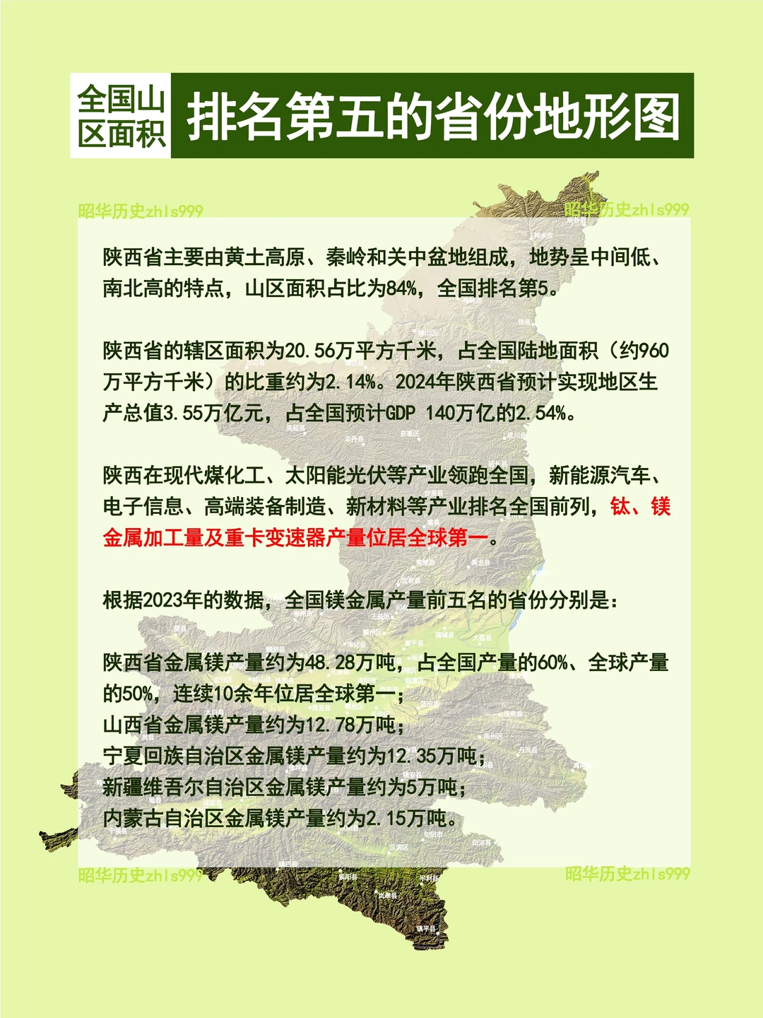 陕西在现代煤化工、太阳能光伏等产业领跑全国,新能源汽车、电子信息、高端装备制造、新材料等产业排名全国前列,钛、镁金属加工量及重卡变速器产量位居全球第一。